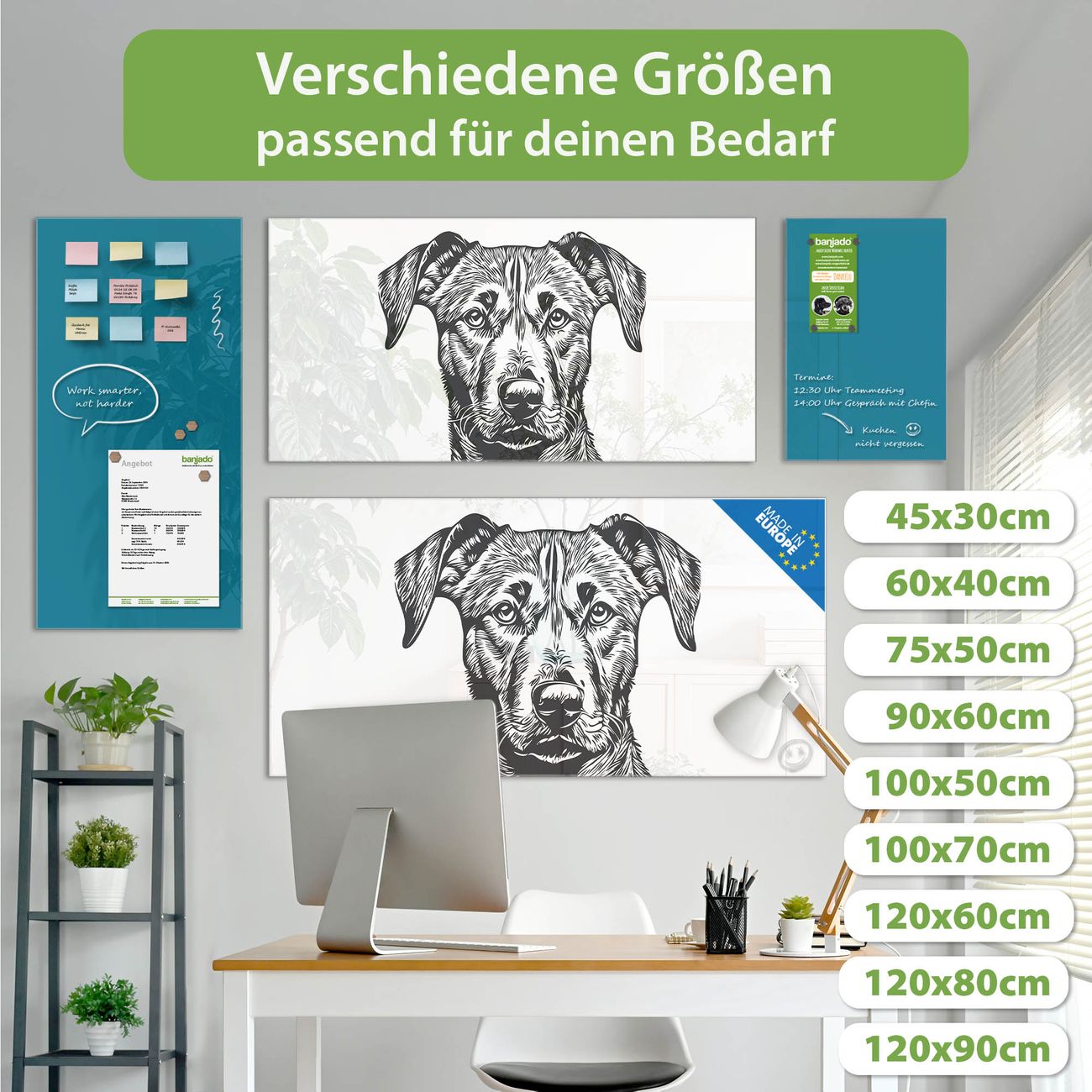 Ein Stück Design, das Ihren Alltag organisiert. Schreiben, heften, inspirieren - alles an einem Ort. Qualität, die man spürt. Montage leicht gemacht. Handwerk mit Herz - veredelt in Sachsen. Einzigartiges Design mit Motiv Motiv Hundeskizze Beschreibbare Glasoberfläche, leicht zu reinigen Starke Magnetkraft durch Stahlrückwand Inklusive 4 Neodym-Magneten Flexible Montageoptionen Handveredelt in Sachsen - Qualität, die bleibt