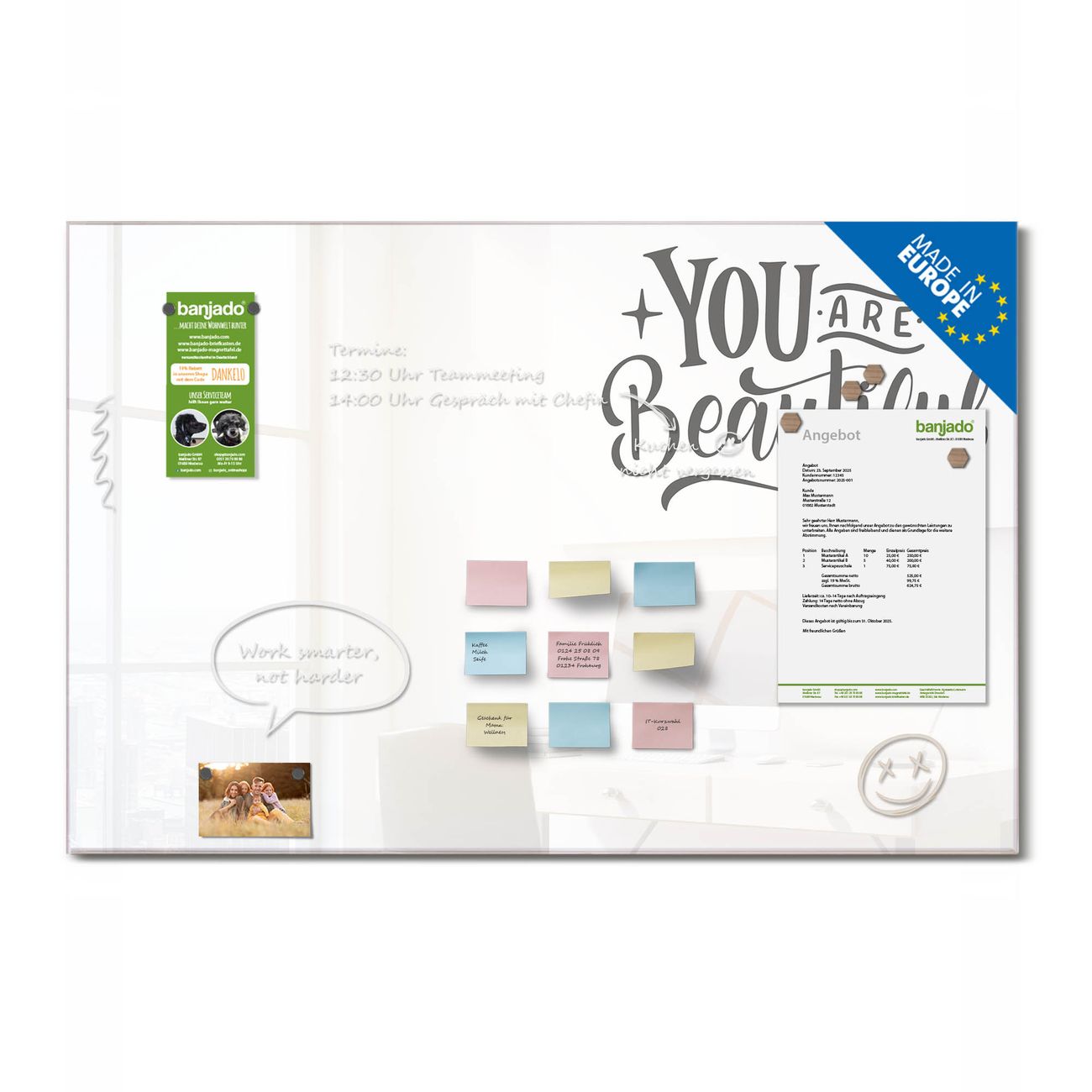 Jede Glas Magnettafel wird in unserer Werkstatt von Hand gefertigt und sorgfältig geprüft. So erhalten Sie ein echtes Qualitätsprodukt, das Funktion und Ästhetik perfekt vereint.?? Warum banjado?