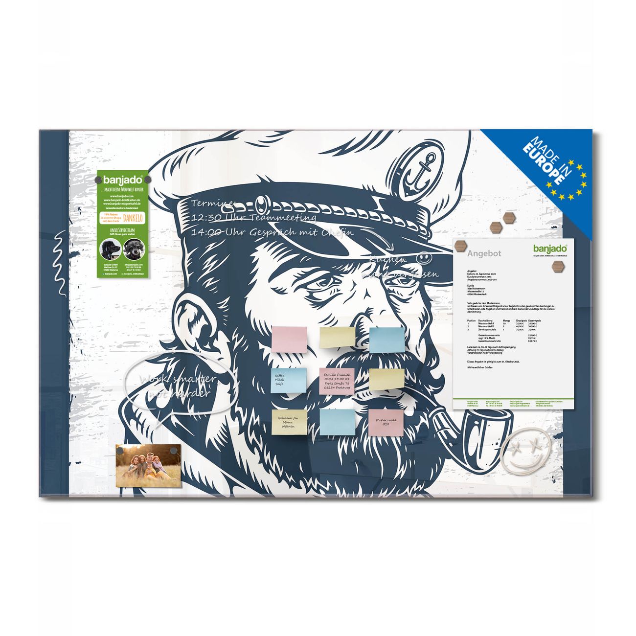 Ein Stück Design, das Ihren Alltag organisiert. Schreiben, heften, inspirieren - alles an einem Ort. Qualität, die man spürt. Montage leicht gemacht. Handwerk mit Herz - veredelt in Sachsen. Einzigartiges Design mit Motiv Motiv Kapitän Portrait Beschreibbare Glasoberfläche, leicht zu reinigen Starke Magnetkraft durch Stahlrückwand Inklusive 4 Neodym-Magneten Flexible Montageoptionen Handveredelt in Sachsen - Qualität, die bleibt