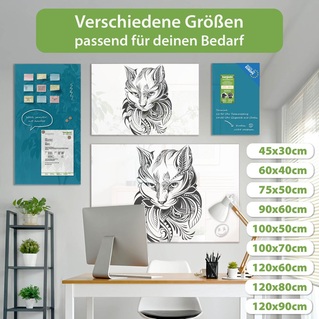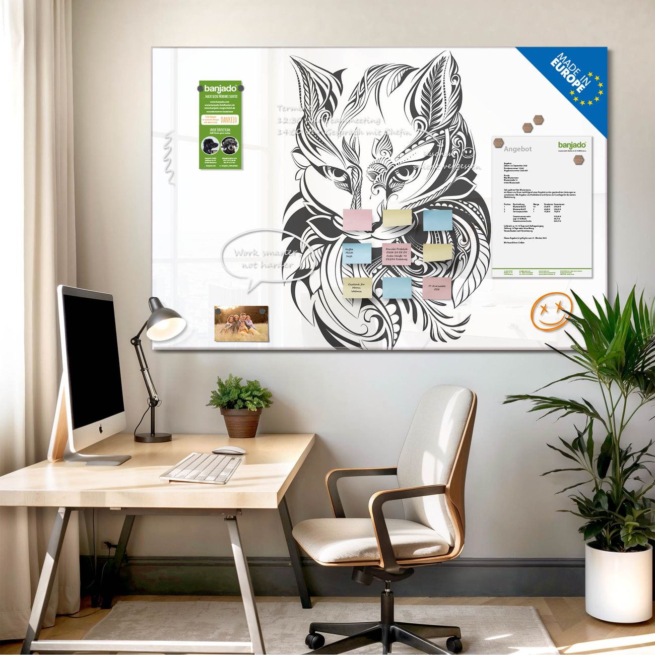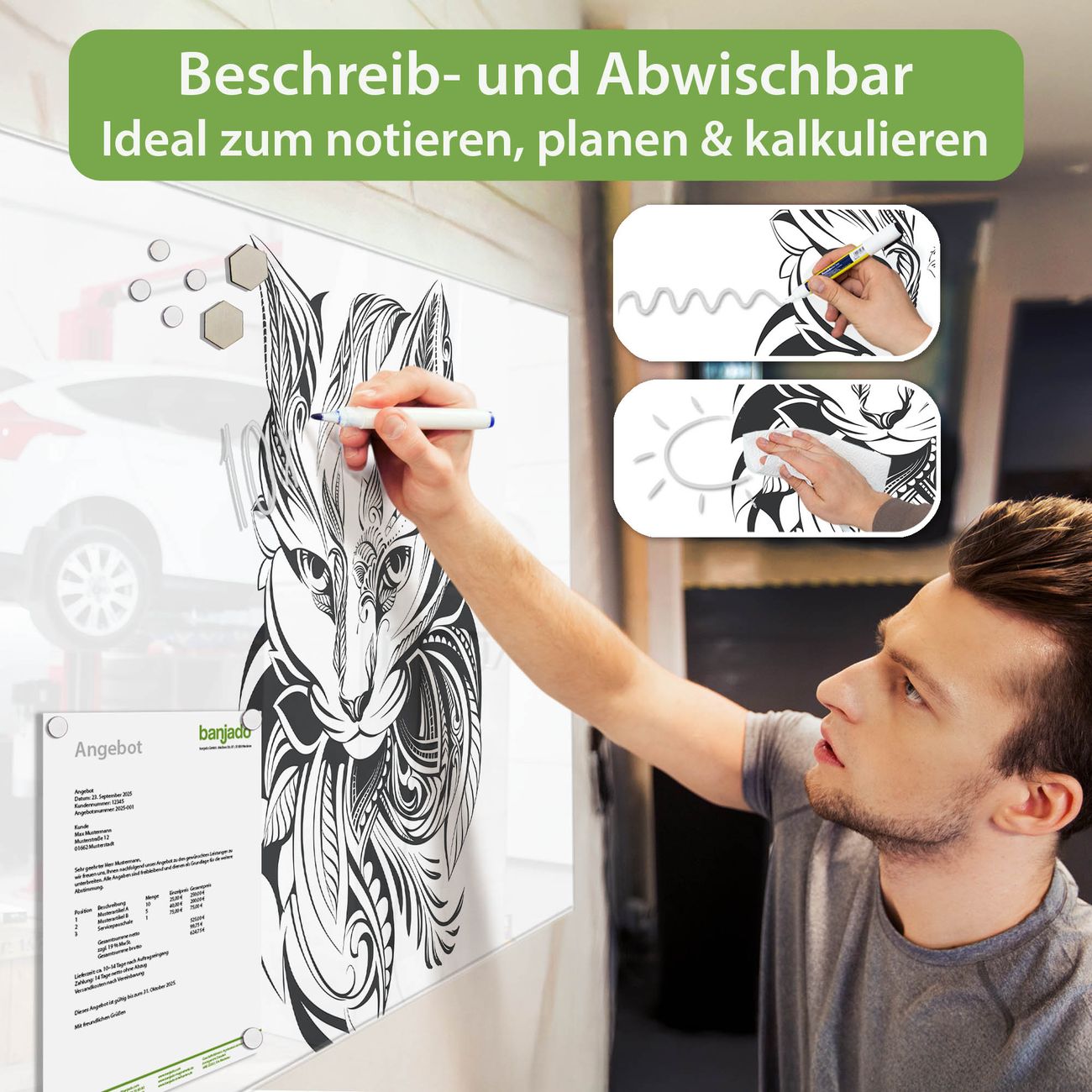 Jede Glas Magnettafel wird in unserer Werkstatt von Hand gefertigt und sorgfältig geprüft. So erhalten Sie ein echtes Qualitätsprodukt, das Funktion und Ästhetik perfekt vereint.?? Warum banjado?