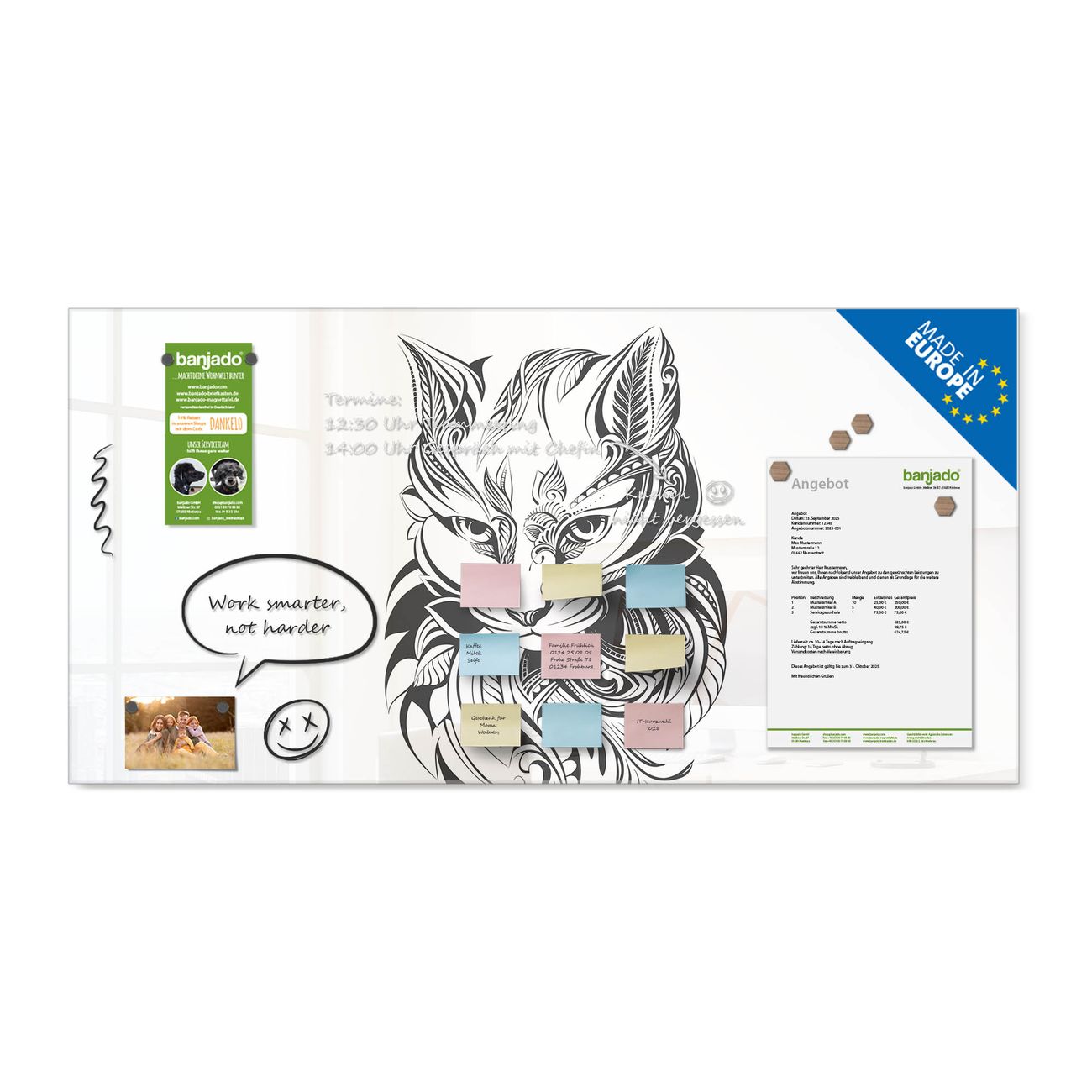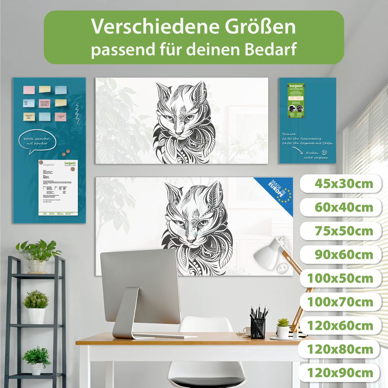 Jede Glas Magnettafel wird in unserer Werkstatt von Hand gefertigt und sorgfältig geprüft. So erhalten Sie ein echtes Qualitätsprodukt, das Funktion und Ästhetik perfekt vereint.?? Warum banjado?