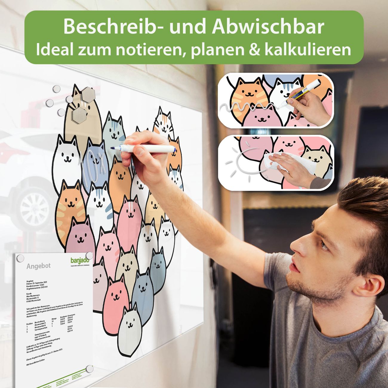 Jede Glas Magnettafel wird in unserer Werkstatt von Hand gefertigt und sorgfältig geprüft. So erhalten Sie ein echtes Qualitätsprodukt, das Funktion und Ästhetik perfekt vereint.?? Warum banjado?