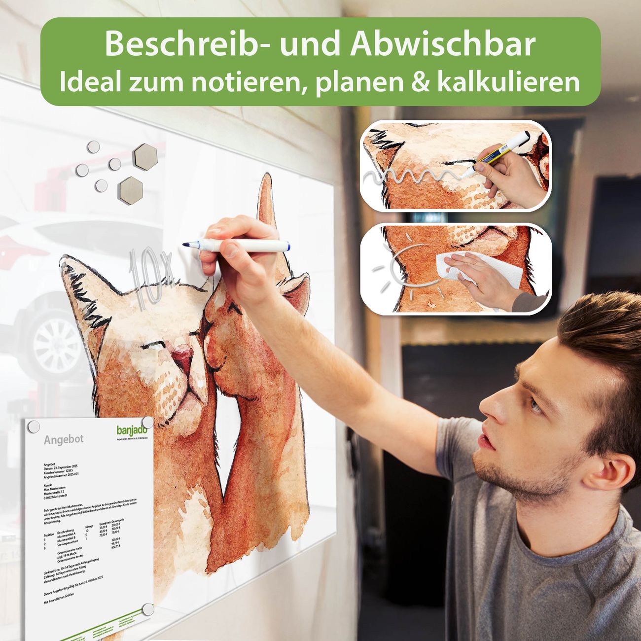Jede Glas Magnettafel wird in unserer Werkstatt von Hand gefertigt und sorgfältig geprüft. So erhalten Sie ein echtes Qualitätsprodukt, das Funktion und Ästhetik perfekt vereint.?? Warum banjado?