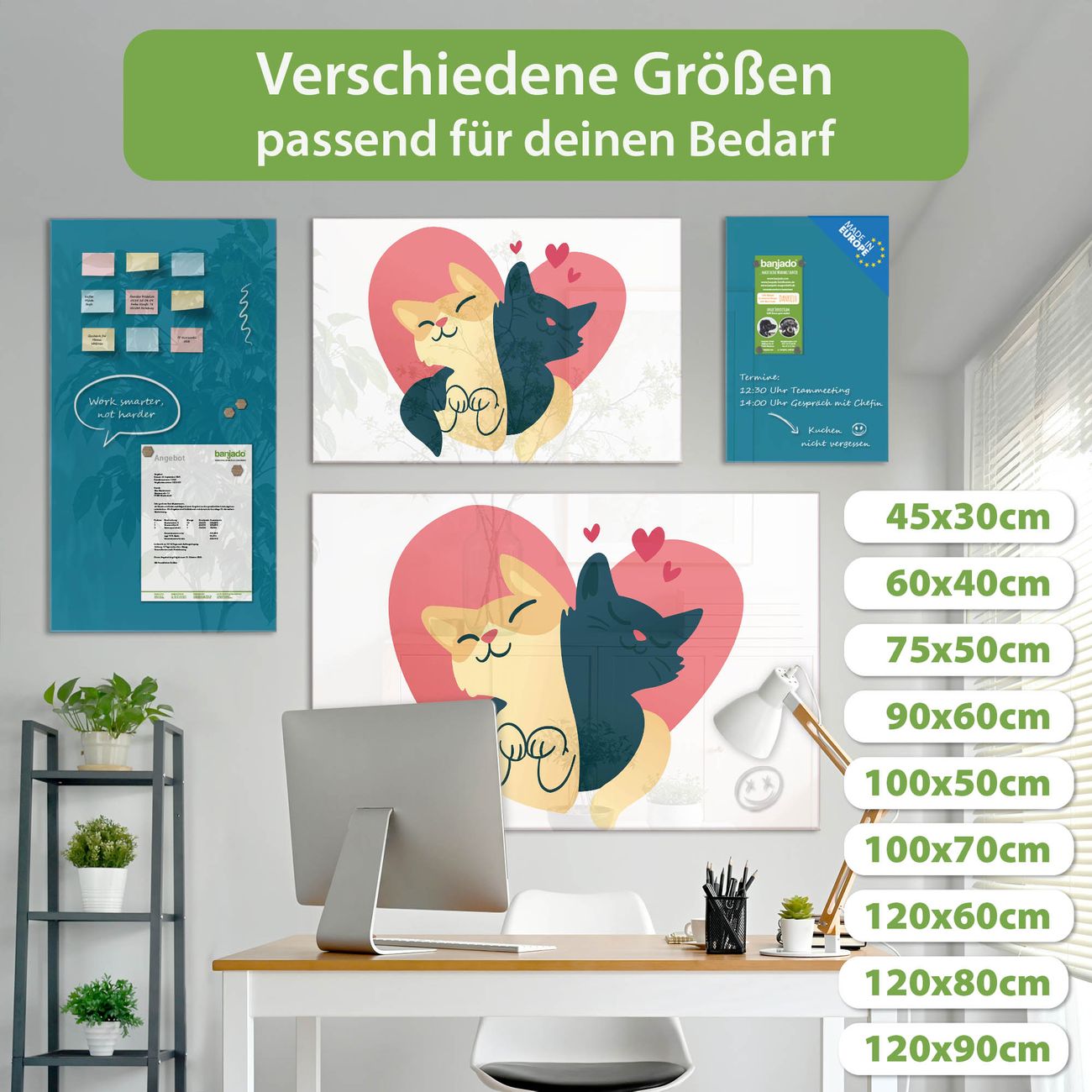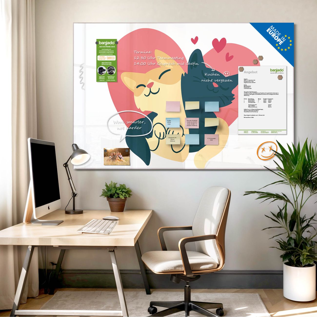 Jede Glas Magnettafel wird in unserer Werkstatt von Hand gefertigt und sorgfältig geprüft. So erhalten Sie ein echtes Qualitätsprodukt, das Funktion und Ästhetik perfekt vereint.?? Warum banjado?