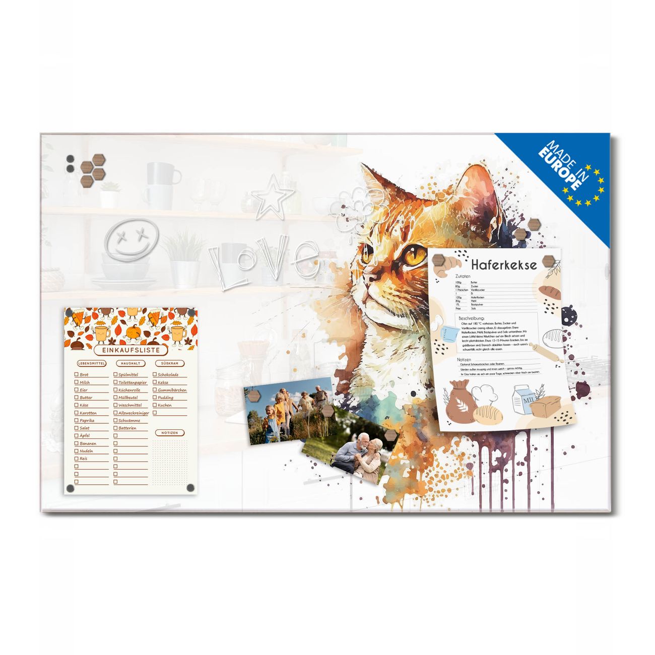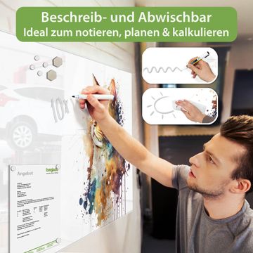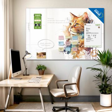 Ein Stück Design, das Ihren Alltag organisiert. Schreiben, heften, inspirieren - alles an einem Ort. Qualität, die man spürt. Montage leicht gemacht. Handwerk mit Herz - veredelt in Sachsen. Einzigartiges Design mit Motiv Motiv Katzenportrait in Aquarell Beschreibbare Glasoberfläche, leicht zu reinigen Starke Magnetkraft durch Stahlrückwand Inklusive 4 Neodym-Magneten Flexible Montageoptionen Handveredelt in Sachsen - Qualität, die bleibt