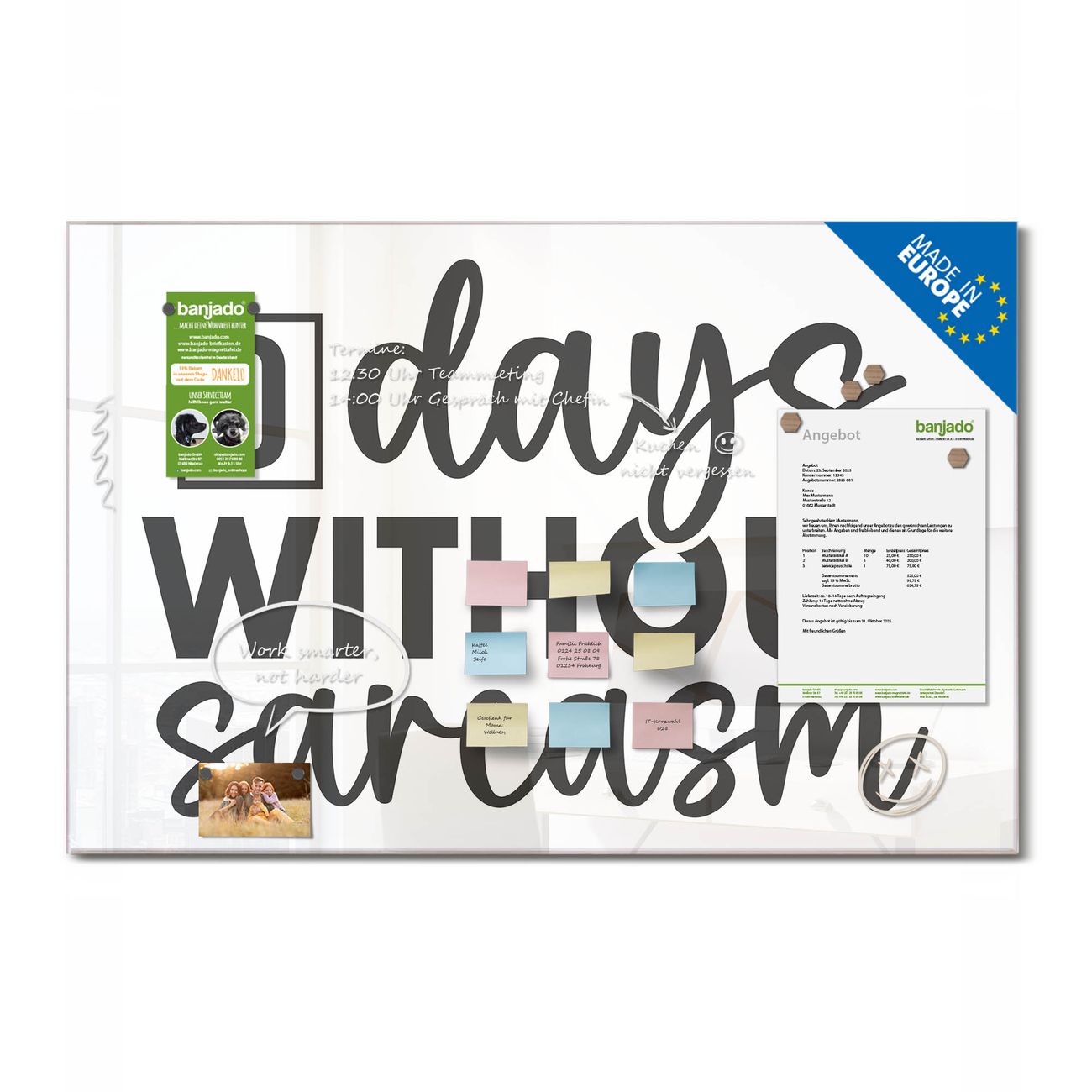 Jede Glas Magnettafel wird in unserer Werkstatt von Hand gefertigt und sorgfältig geprüft. So erhalten Sie ein echtes Qualitätsprodukt, das Funktion und Ästhetik perfekt vereint.?? Warum banjado?