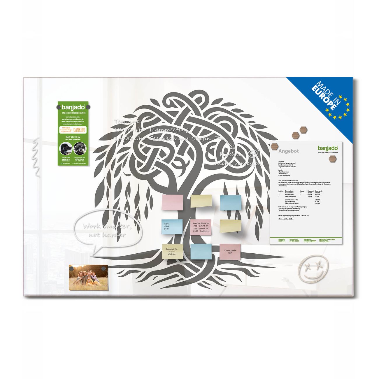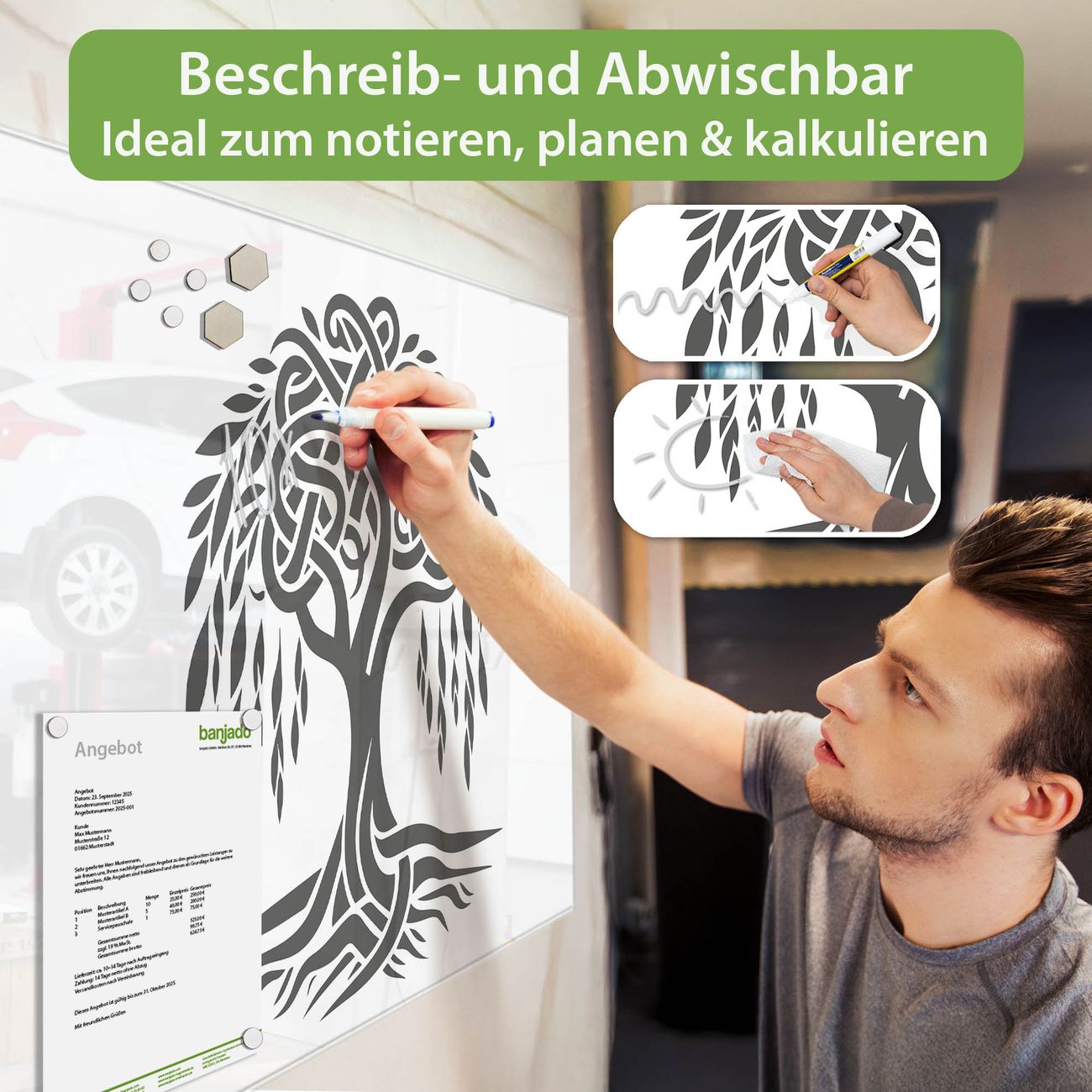 Jede Glas Magnettafel wird in unserer Werkstatt von Hand gefertigt und sorgfältig geprüft. So erhalten Sie ein echtes Qualitätsprodukt, das Funktion und Ästhetik perfekt vereint.?? Warum banjado?