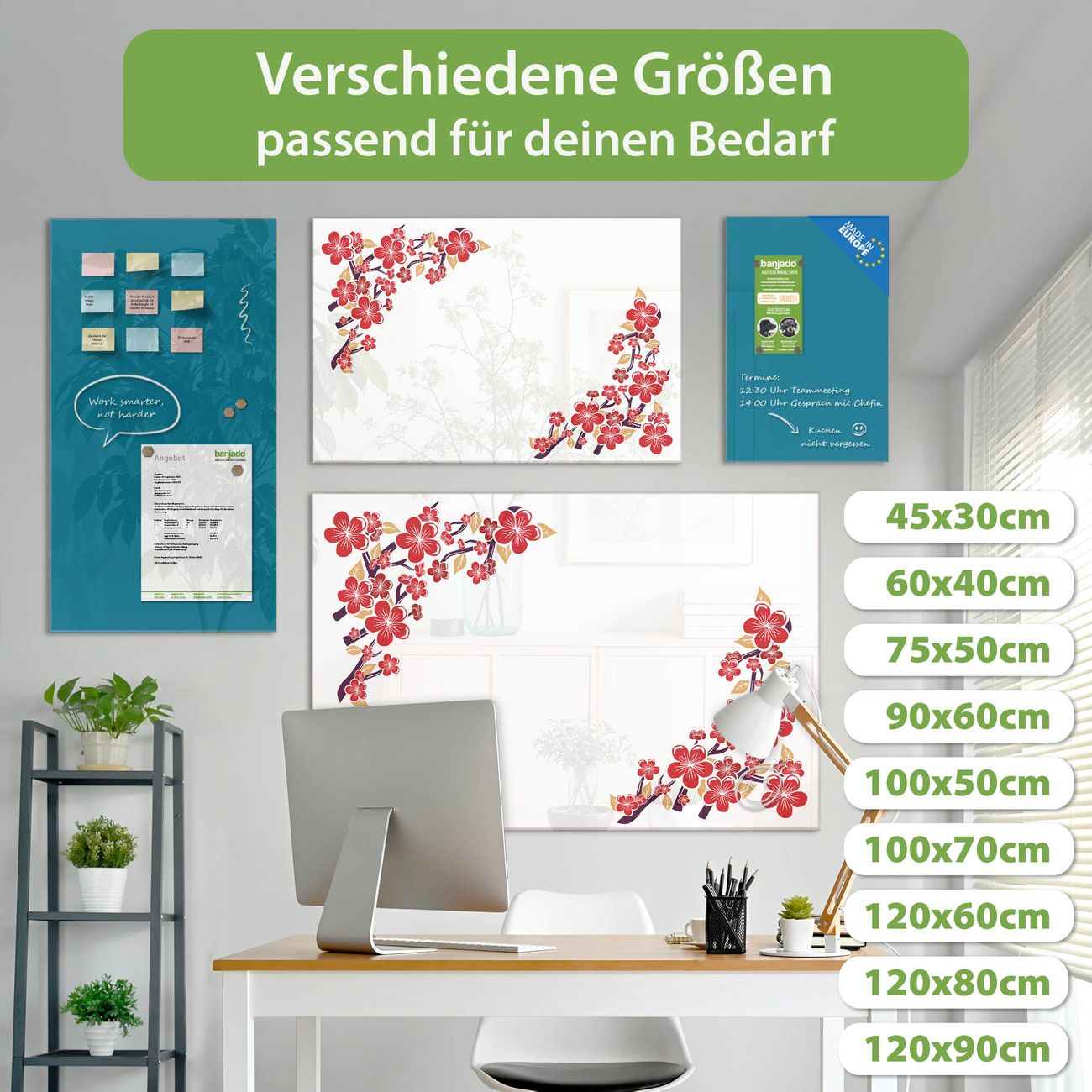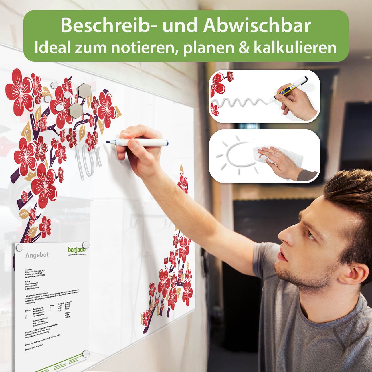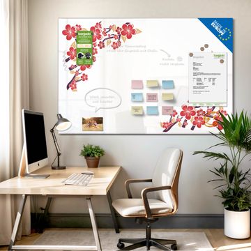 Die banjado Glas Magnettafel mit dem Motiv Motiv Kirschblütenmuster verbindet Funktionalität mit Stil. Sie ersetzt das Zettelchaos durch klare Strukturen und bringt dabei eine warme, natürliche Atmosphäre in Ihr Zuhause. Ob im Büro, in der Küche oder im Eingangsbereich - dieses Design-Board zieht Blicke an und sorgt für Ordnung mit Charakter.