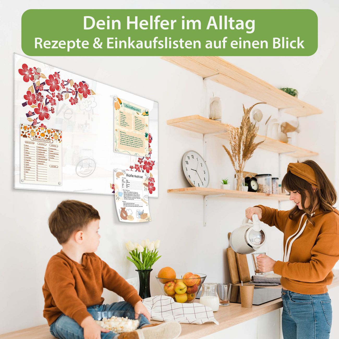 Ein Stück Design, das Ihren Alltag organisiert. Schreiben, heften, inspirieren - alles an einem Ort. Qualität, die man spürt. Montage leicht gemacht. Handwerk mit Herz - veredelt in Sachsen. Einzigartiges Design mit Motiv Motiv Kirschblütenmuster Beschreibbare Glasoberfläche, leicht zu reinigen Starke Magnetkraft durch Stahlrückwand Inklusive 4 Neodym-Magneten Flexible Montageoptionen Handveredelt in Sachsen - Qualität, die bleibt