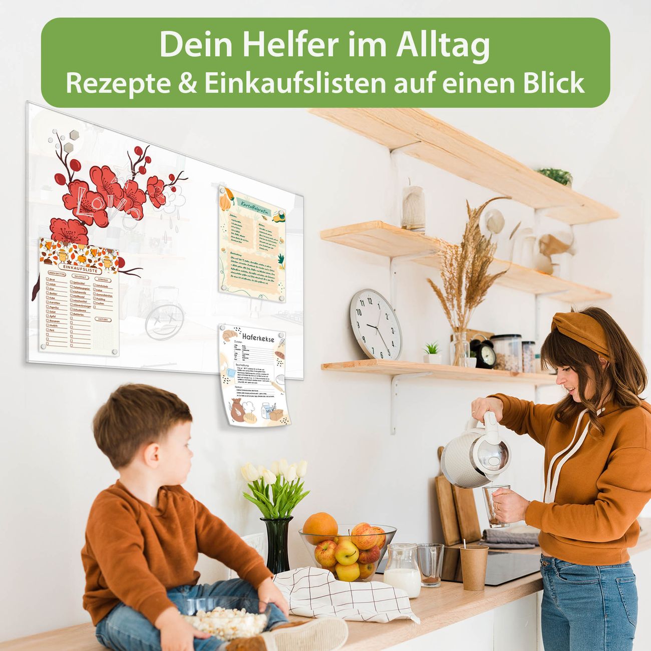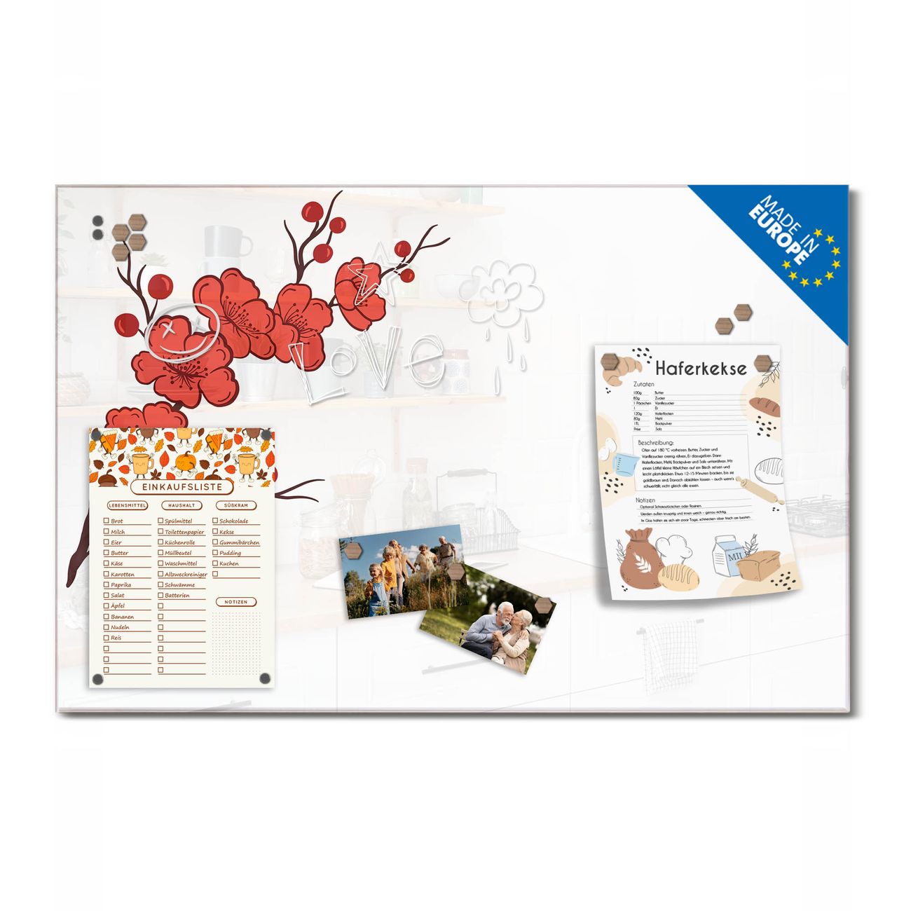 Auf der glatten Glasoberfläche lassen sich Termine, Rezepte oder Notizen ganz einfach mit Kreidestiften festhalten und rückstandslos entfernen. Starke Neodym-Magnete halten Ihre wichtigsten Erinnerungen sicher an Ort und Stelle. So entsteht Ihre ganz persönliche Ideenwand - jeden Tag neu.