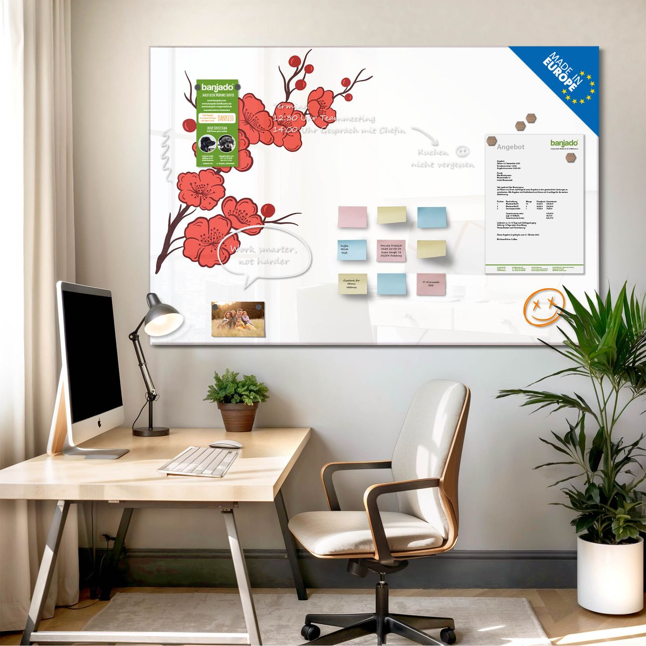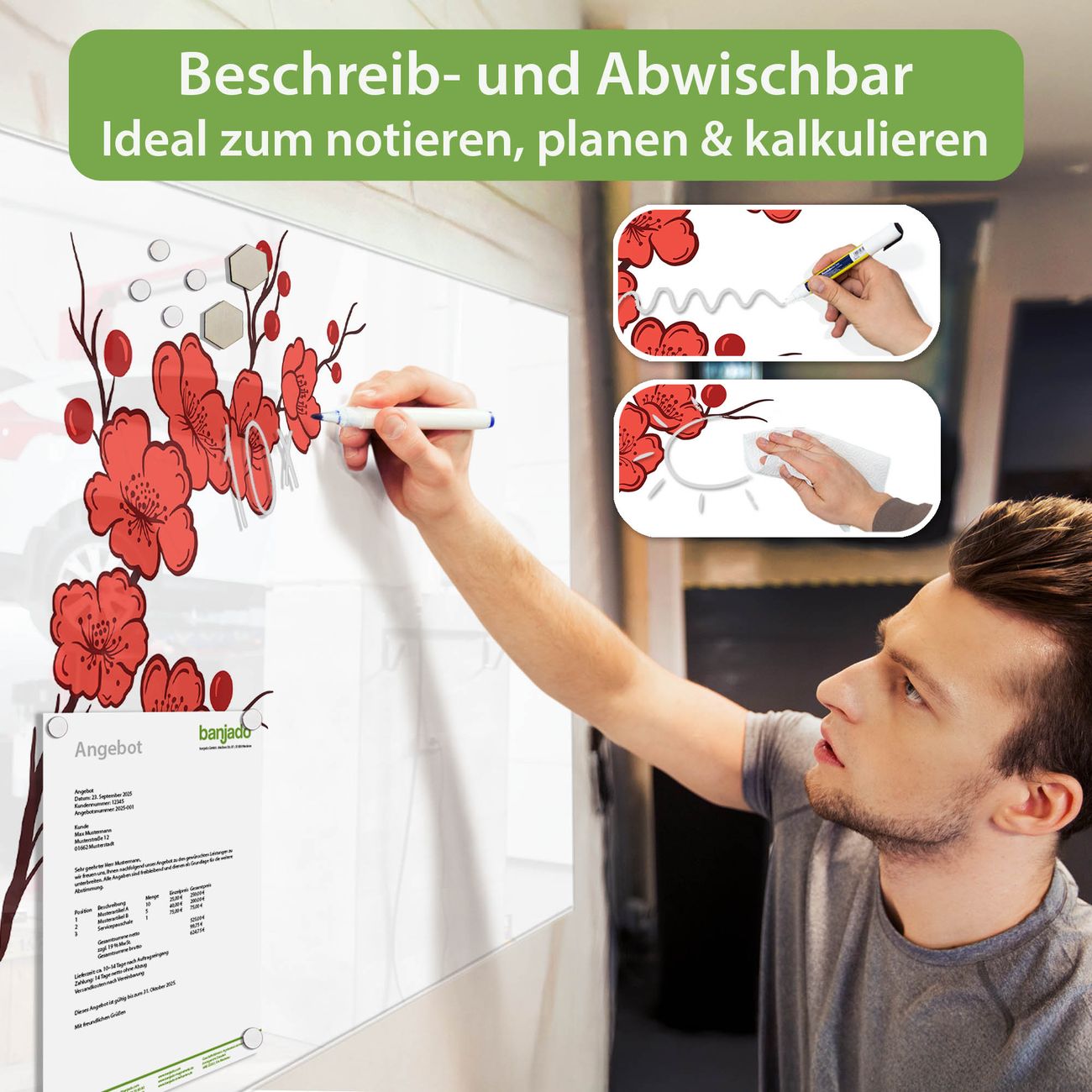 Jede Glas Magnettafel wird in unserer Werkstatt von Hand gefertigt und sorgfältig geprüft. So erhalten Sie ein echtes Qualitätsprodukt, das Funktion und Ästhetik perfekt vereint.?? Warum banjado?