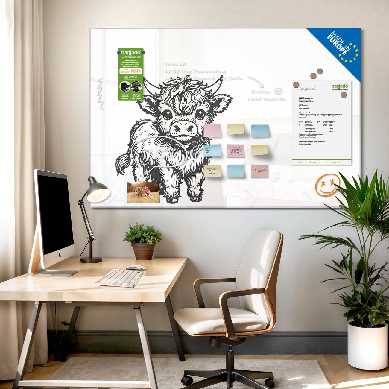 Jede Glas Magnettafel wird in unserer Werkstatt von Hand gefertigt und sorgfältig geprüft. So erhalten Sie ein echtes Qualitätsprodukt, das Funktion und Ästhetik perfekt vereint.?? Warum banjado?