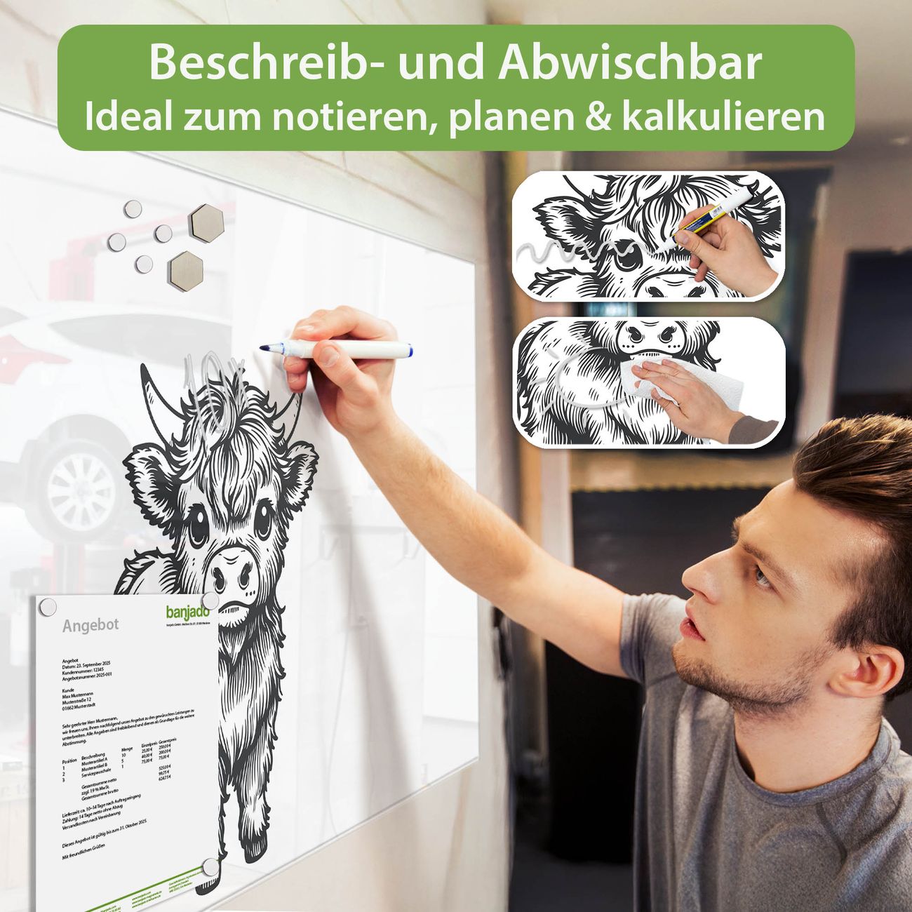 Ein Stück Design, das Ihren Alltag organisiert. Schreiben, heften, inspirieren - alles an einem Ort. Qualität, die man spürt. Montage leicht gemacht. Handwerk mit Herz - veredelt in Sachsen. Einzigartiges Design mit Motiv Motiv Kleines Hochlandrind Beschreibbare Glasoberfläche, leicht zu reinigen Starke Magnetkraft durch Stahlrückwand Inklusive 4 Neodym-Magneten Flexible Montageoptionen Handveredelt in Sachsen - Qualität, die bleibt