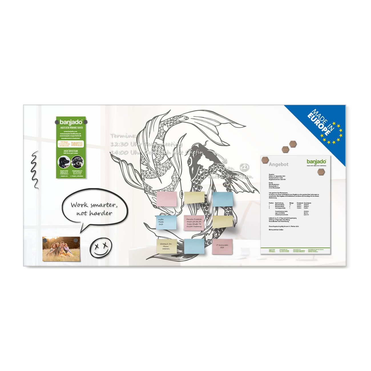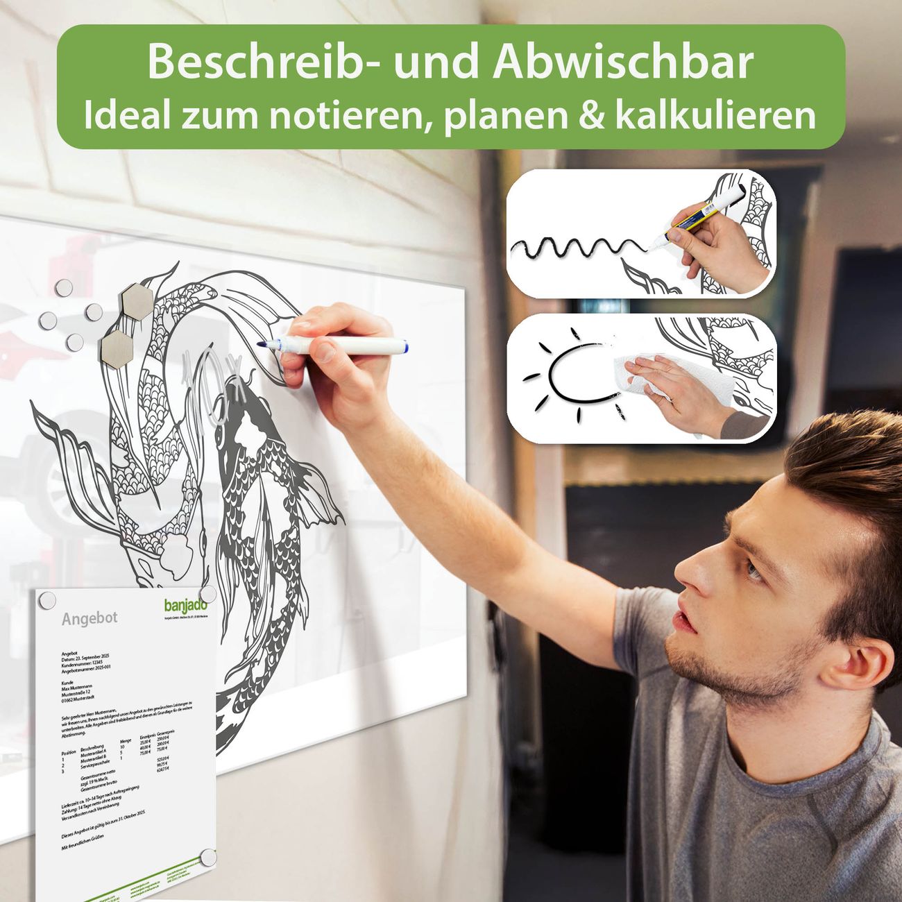 Jede Glas Magnettafel wird in unserer Werkstatt von Hand gefertigt und sorgfältig geprüft. So erhalten Sie ein echtes Qualitätsprodukt, das Funktion und Ästhetik perfekt vereint.?? Warum banjado?