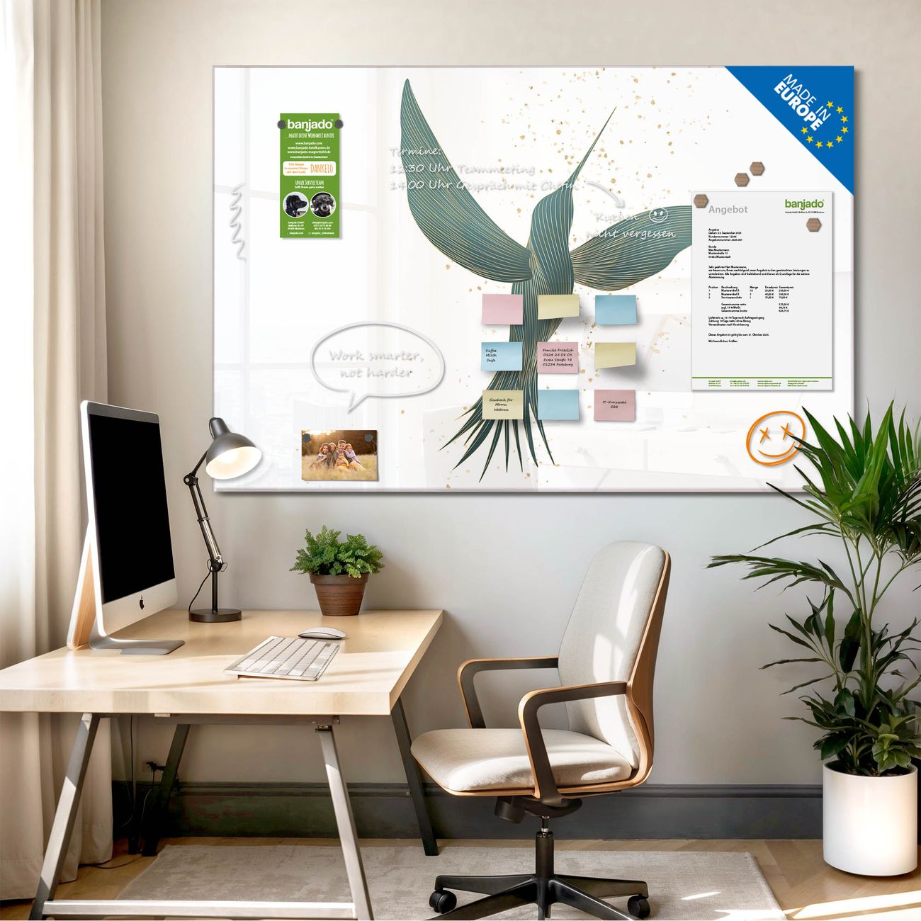 Die banjado Glas Magnettafel mit dem Motiv Motiv Kolibri 4 verbindet Funktionalität mit Stil. Sie ersetzt das Zettelchaos durch klare Strukturen und bringt dabei eine warme, natürliche Atmosphäre in Ihr Zuhause. Ob im Büro, in der Küche oder im Eingangsbereich - dieses Design-Board zieht Blicke an und sorgt für Ordnung mit Charakter.