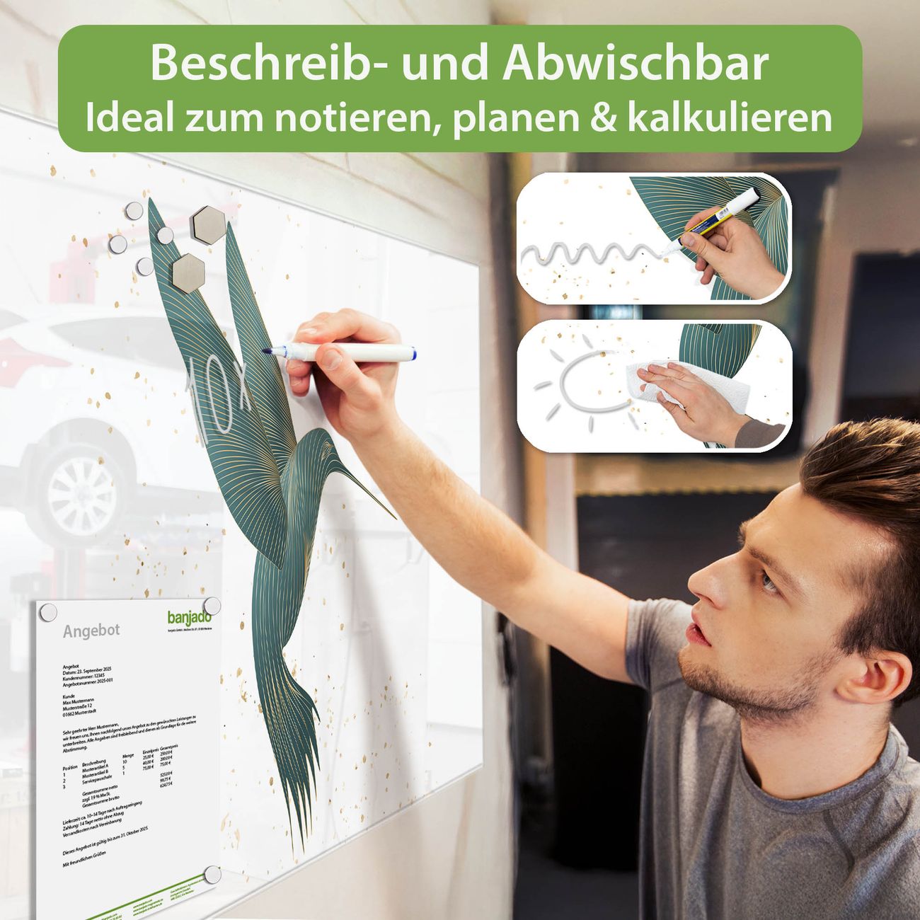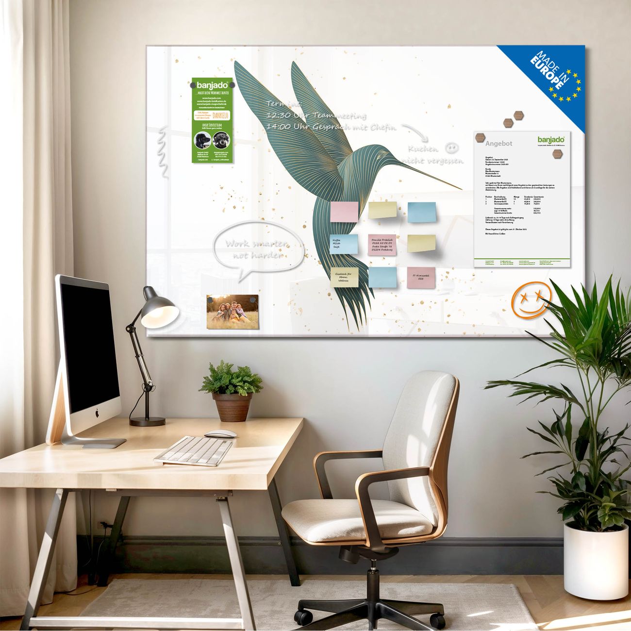 Die banjado Glas Magnettafel mit dem Motiv Motiv Kolibri 5 verbindet Funktionalität mit Stil. Sie ersetzt das Zettelchaos durch klare Strukturen und bringt dabei eine warme, natürliche Atmosphäre in Ihr Zuhause. Ob im Büro, in der Küche oder im Eingangsbereich - dieses Design-Board zieht Blicke an und sorgt für Ordnung mit Charakter.