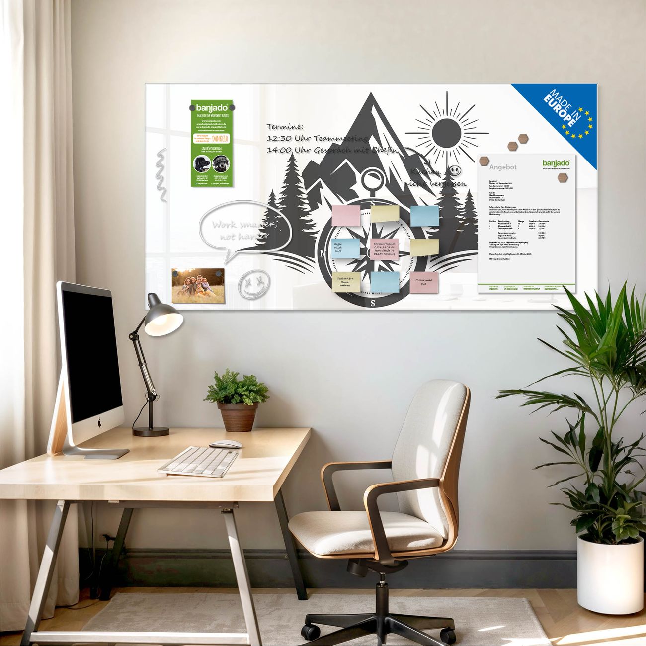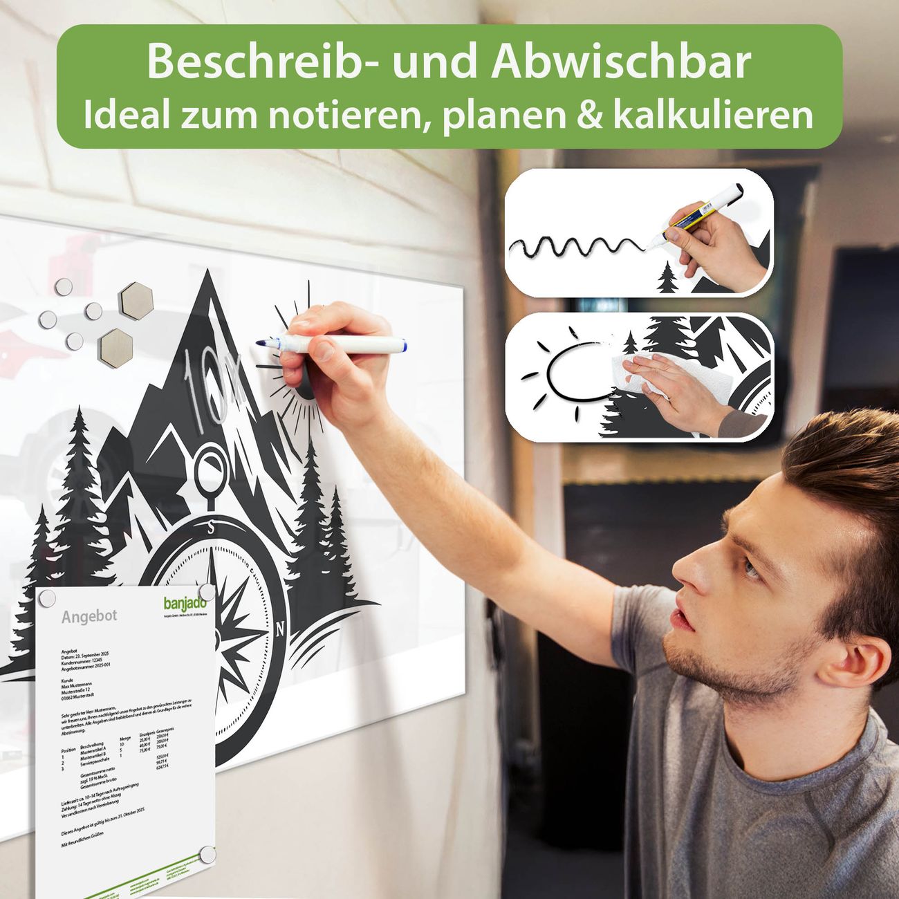 Jede Glas Magnettafel wird in unserer Werkstatt von Hand gefertigt und sorgfältig geprüft. So erhalten Sie ein echtes Qualitätsprodukt, das Funktion und Ästhetik perfekt vereint.?? Warum banjado?