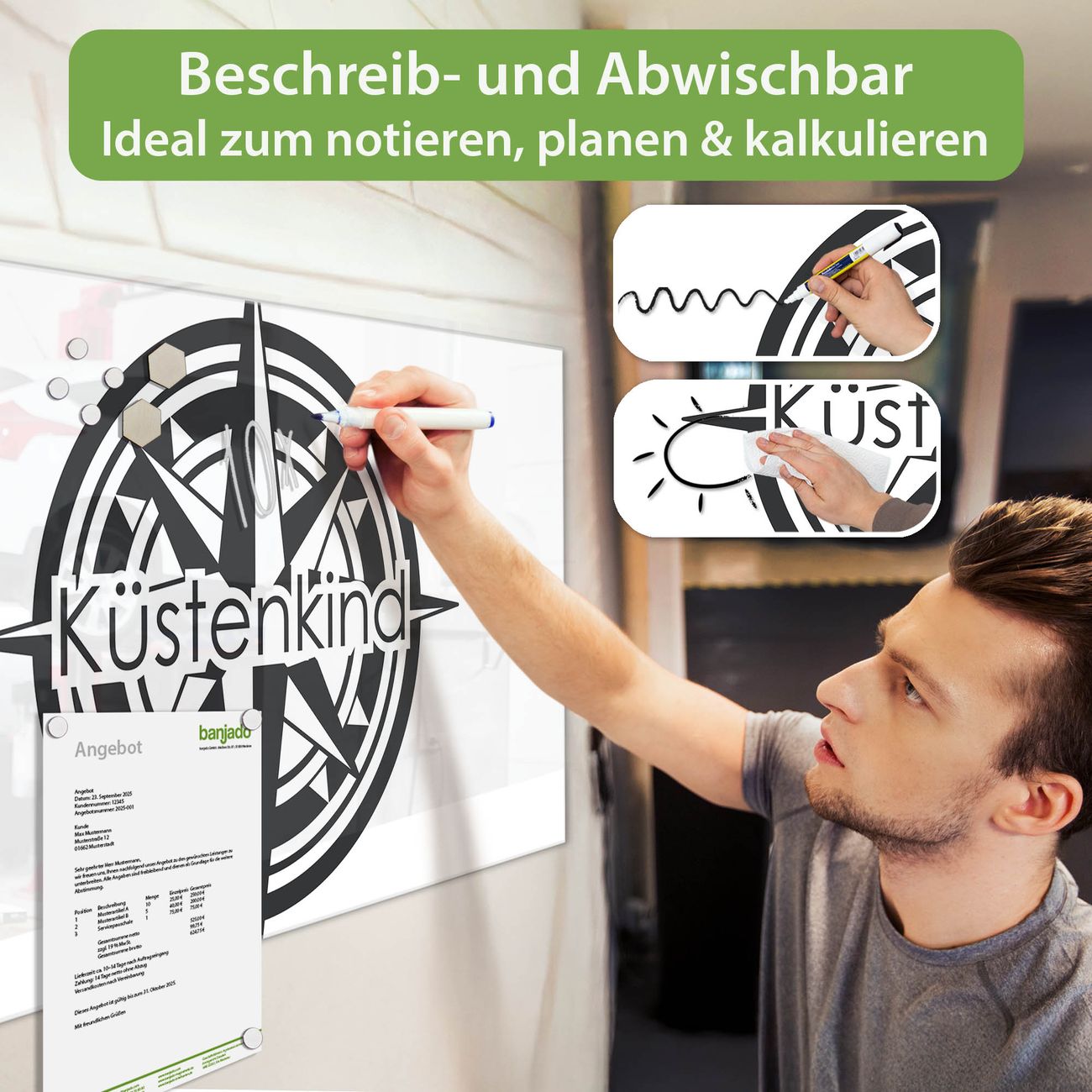 Bitte beachten Sie, dass ausschliessliche spezielle Magnete an der Glastafel haften. Wir empfehlen banjado Neodym Magnete, diese sind durch uns auf Wirksamkeit geprüft.