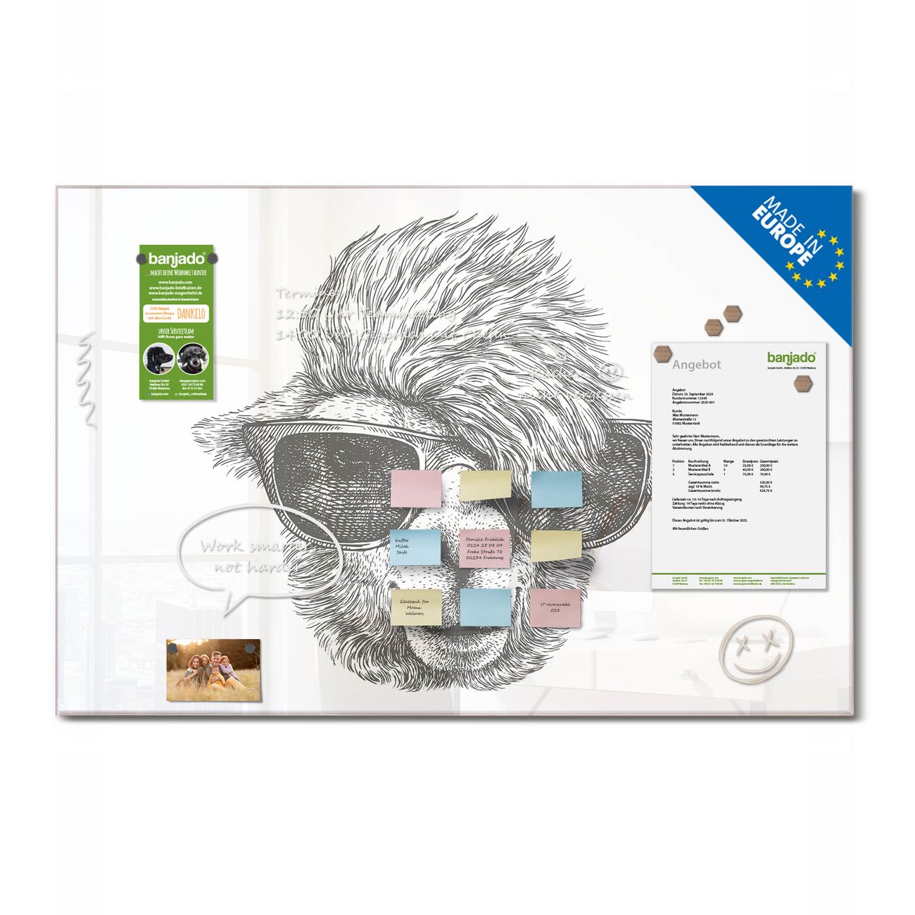 Jede Glas Magnettafel wird in unserer Werkstatt von Hand gefertigt und sorgfältig geprüft. So erhalten Sie ein echtes Qualitätsprodukt, das Funktion und Ästhetik perfekt vereint.?? Warum banjado?