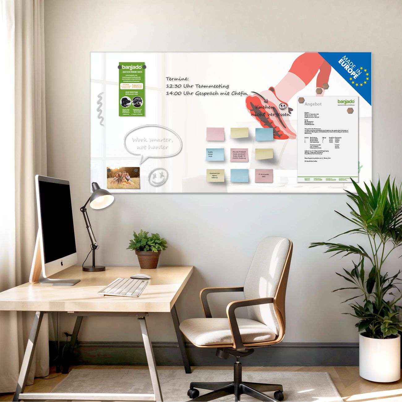 Jede Glas Magnettafel wird in unserer Werkstatt von Hand gefertigt und sorgfältig geprüft. So erhalten Sie ein echtes Qualitätsprodukt, das Funktion und Ästhetik perfekt vereint.?? Warum banjado?