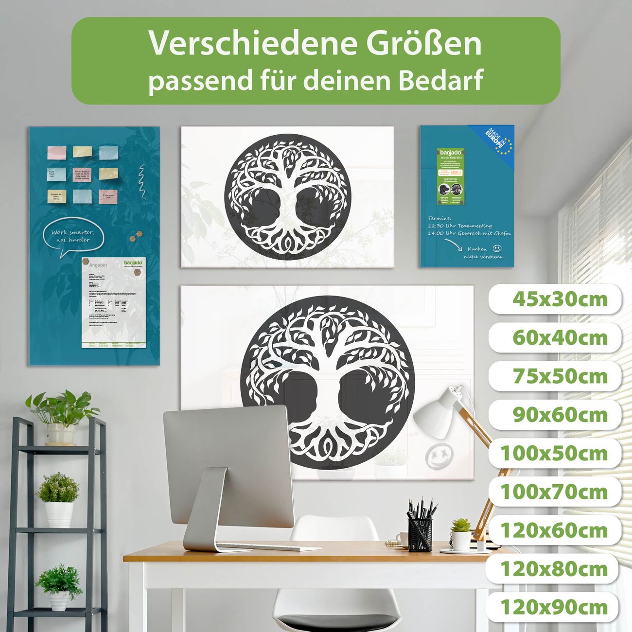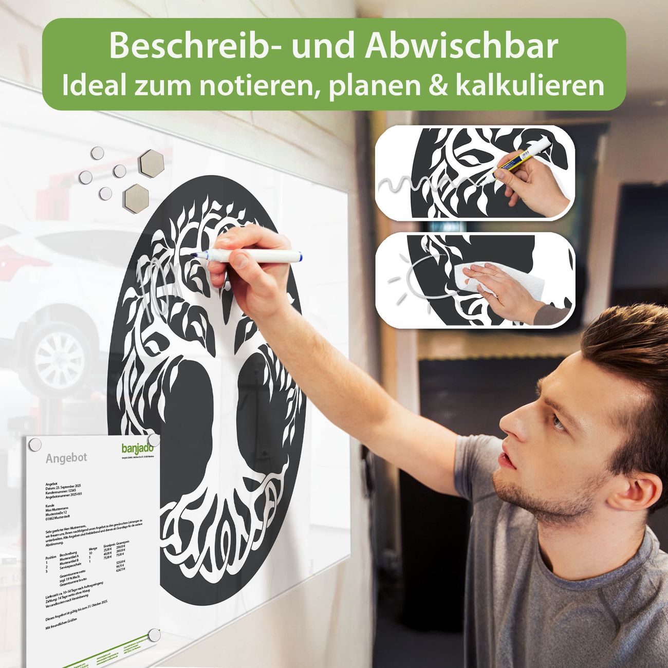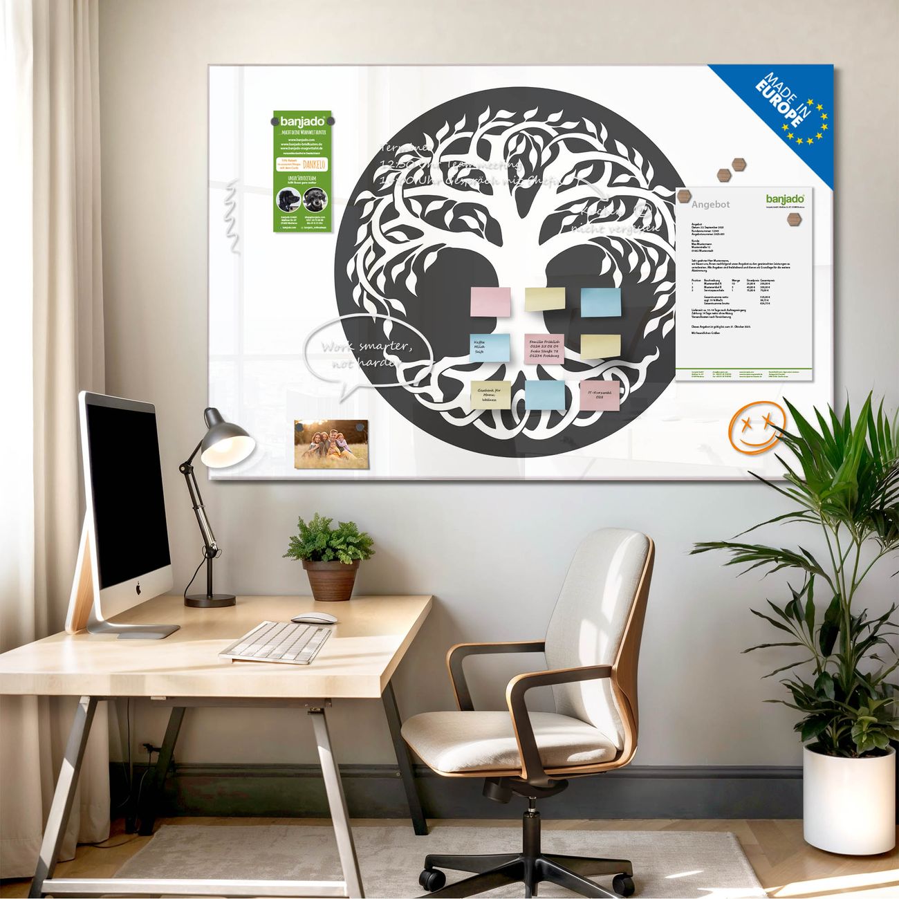 Die banjado Glas Magnettafel mit dem Motiv Motiv Lebensbaum Silhouette verbindet Funktionalität mit Stil. Sie ersetzt das Zettelchaos durch klare Strukturen und bringt dabei eine warme, natürliche Atmosphäre in Ihr Zuhause. Ob im Büro, in der Küche oder im Eingangsbereich - dieses Design-Board zieht Blicke an und sorgt für Ordnung mit Charakter.