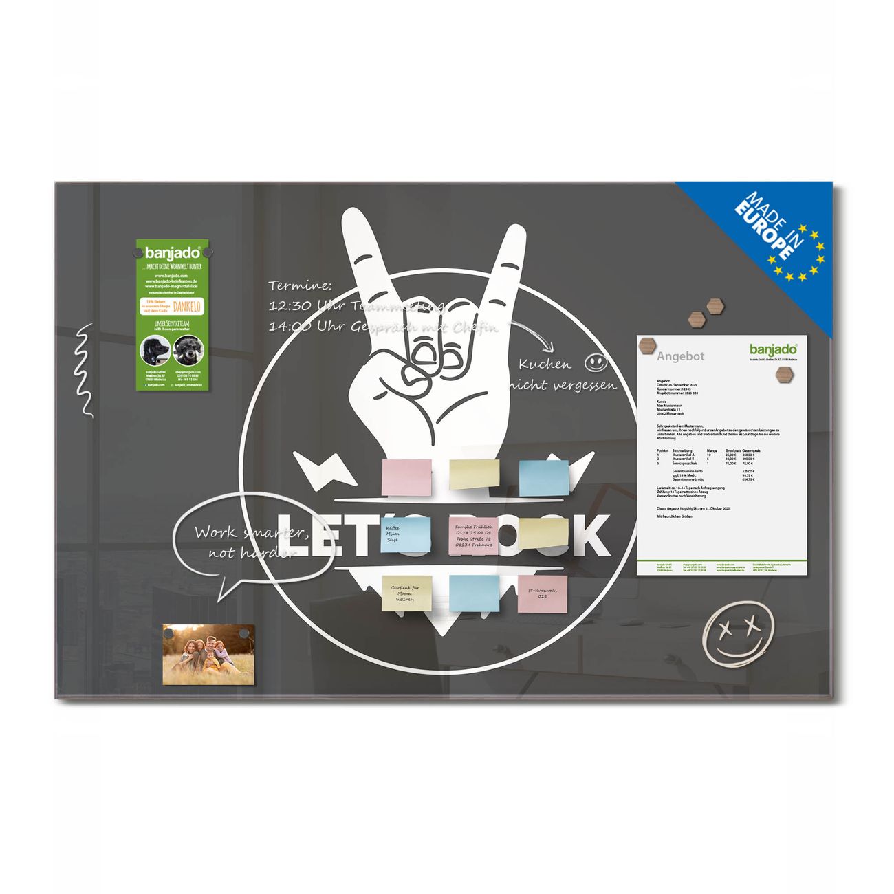 Ein Stück Design, das Ihren Alltag organisiert. Schreiben, heften, inspirieren - alles an einem Ort. Qualität, die man spürt. Montage leicht gemacht. Handwerk mit Herz - veredelt in Sachsen. Einzigartiges Design mit Motiv Motiv Let's Rock Beschreibbare Glasoberfläche, leicht zu reinigen Starke Magnetkraft durch Stahlrückwand Inklusive 4 Neodym-Magneten Flexible Montageoptionen Handveredelt in Sachsen - Qualität, die bleibt