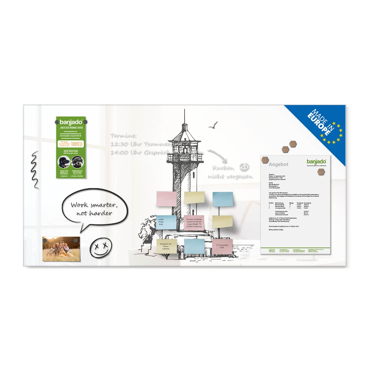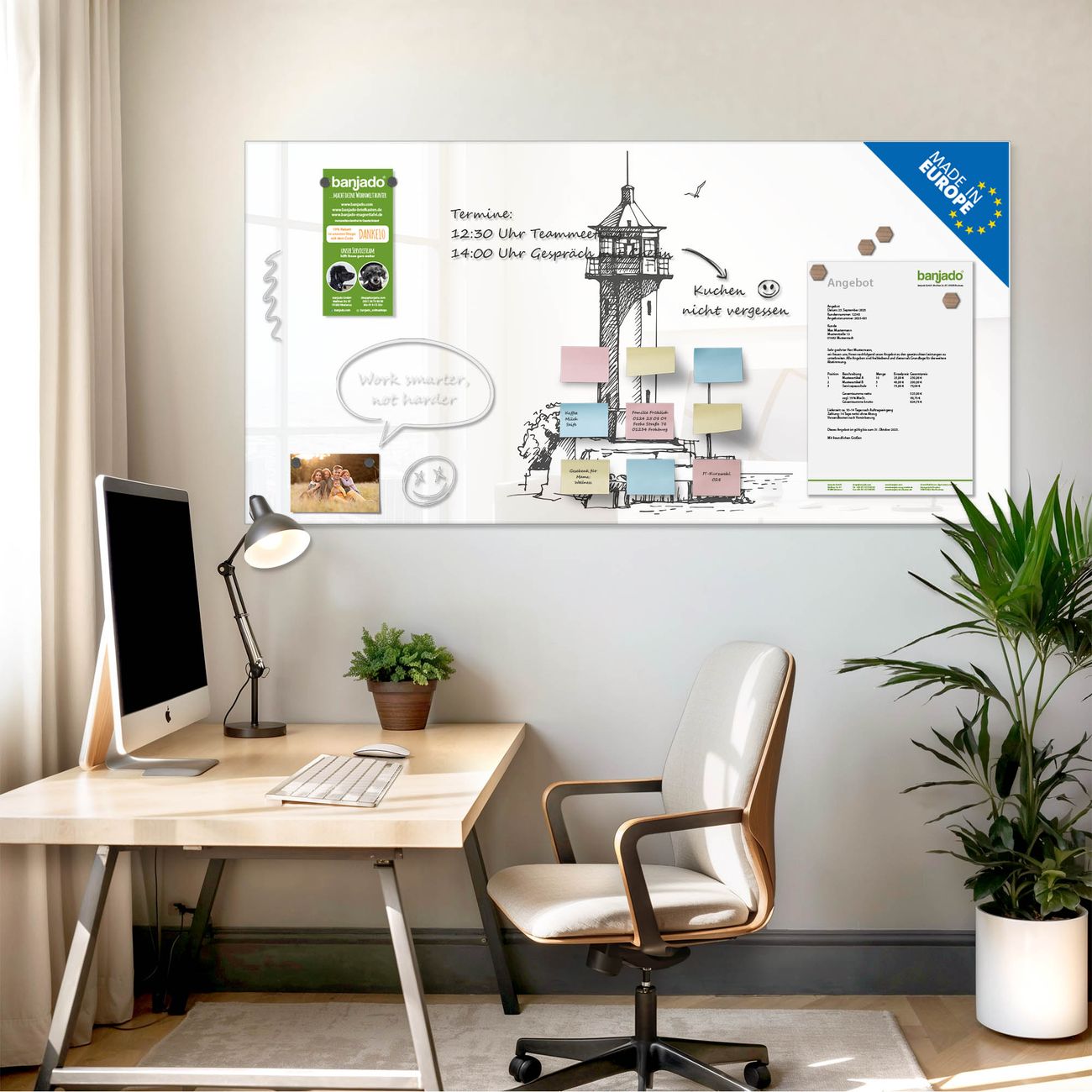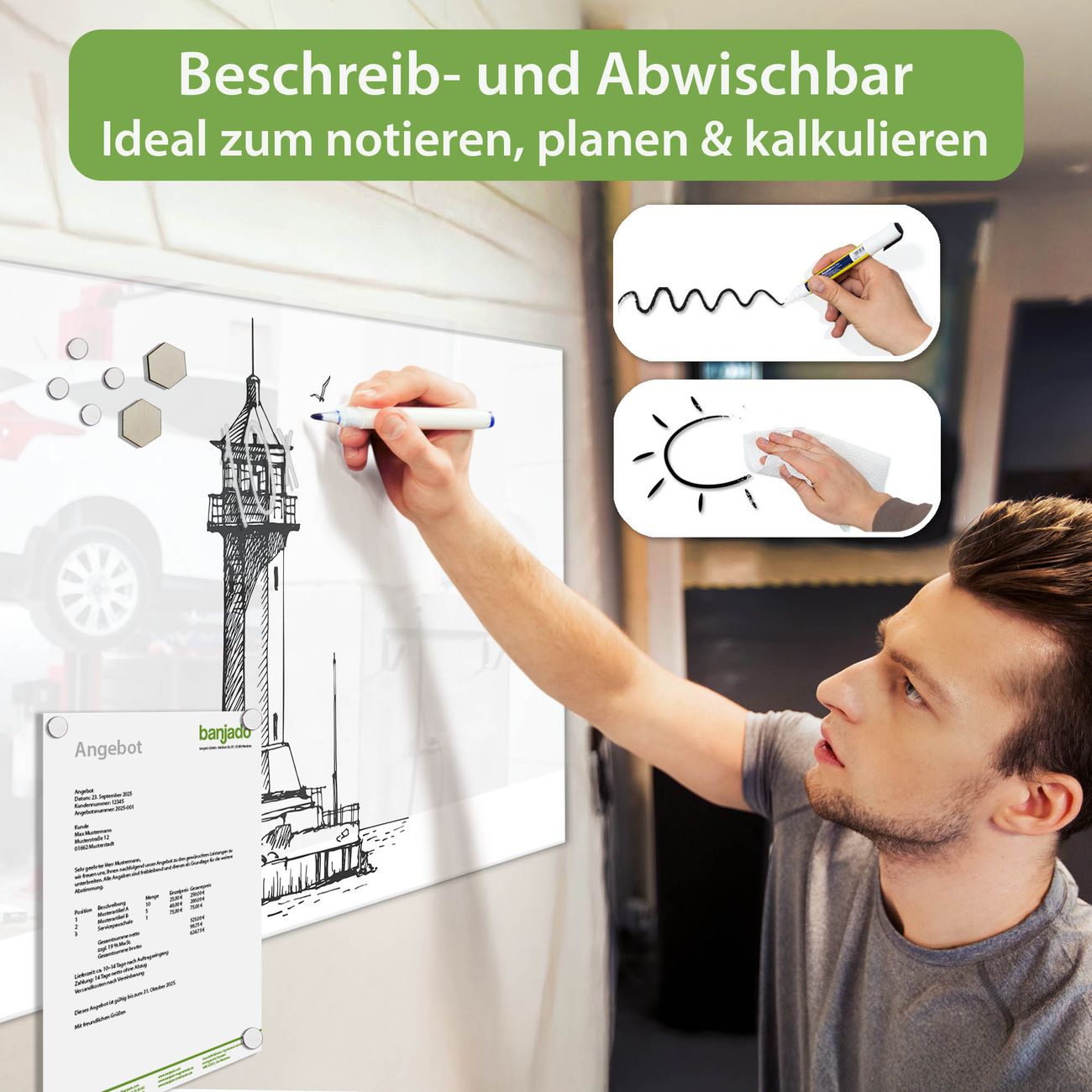 Jede Glas Magnettafel wird in unserer Werkstatt von Hand gefertigt und sorgfältig geprüft. So erhalten Sie ein echtes Qualitätsprodukt, das Funktion und Ästhetik perfekt vereint.?? Warum banjado?