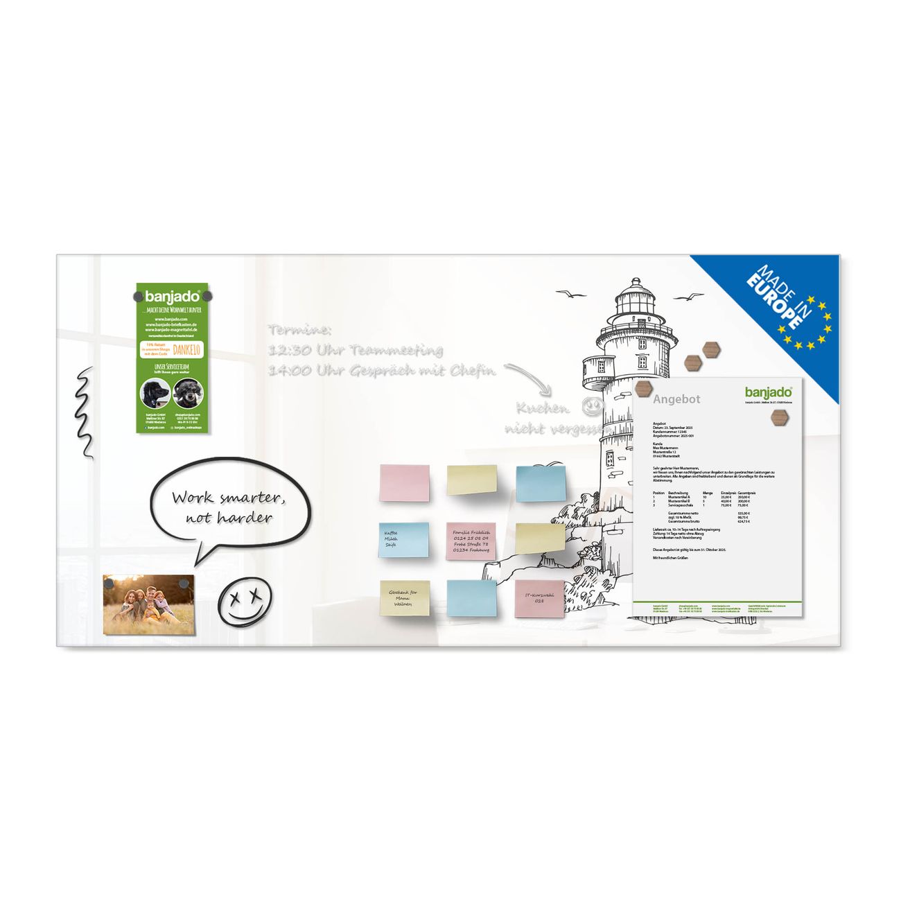Jede Glas Magnettafel wird in unserer Werkstatt von Hand gefertigt und sorgfältig geprüft. So erhalten Sie ein echtes Qualitätsprodukt, das Funktion und Ästhetik perfekt vereint.?? Warum banjado?