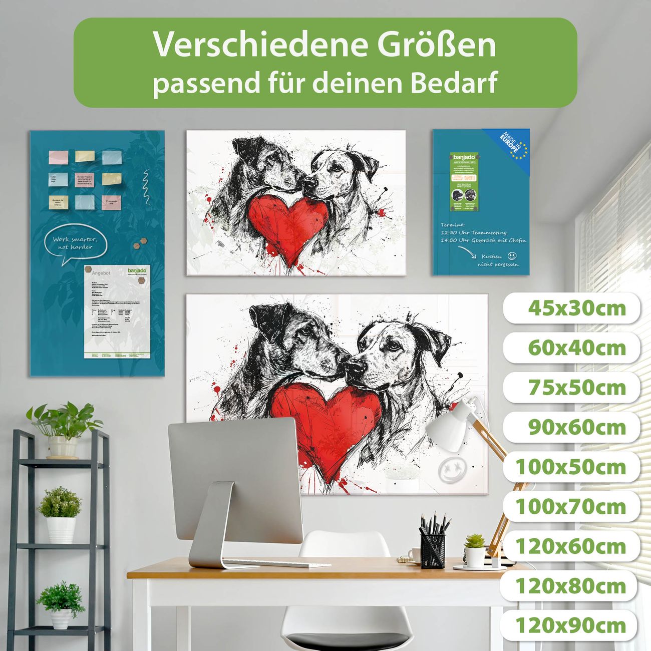 Die banjado Glas Magnettafel mit dem Motiv Motiv Liebende Hunde 2 verbindet Funktionalität mit Stil. Sie ersetzt das Zettelchaos durch klare Strukturen und bringt dabei eine warme, natürliche Atmosphäre in Ihr Zuhause. Ob im Büro, in der Küche oder im Eingangsbereich - dieses Design-Board zieht Blicke an und sorgt für Ordnung mit Charakter.