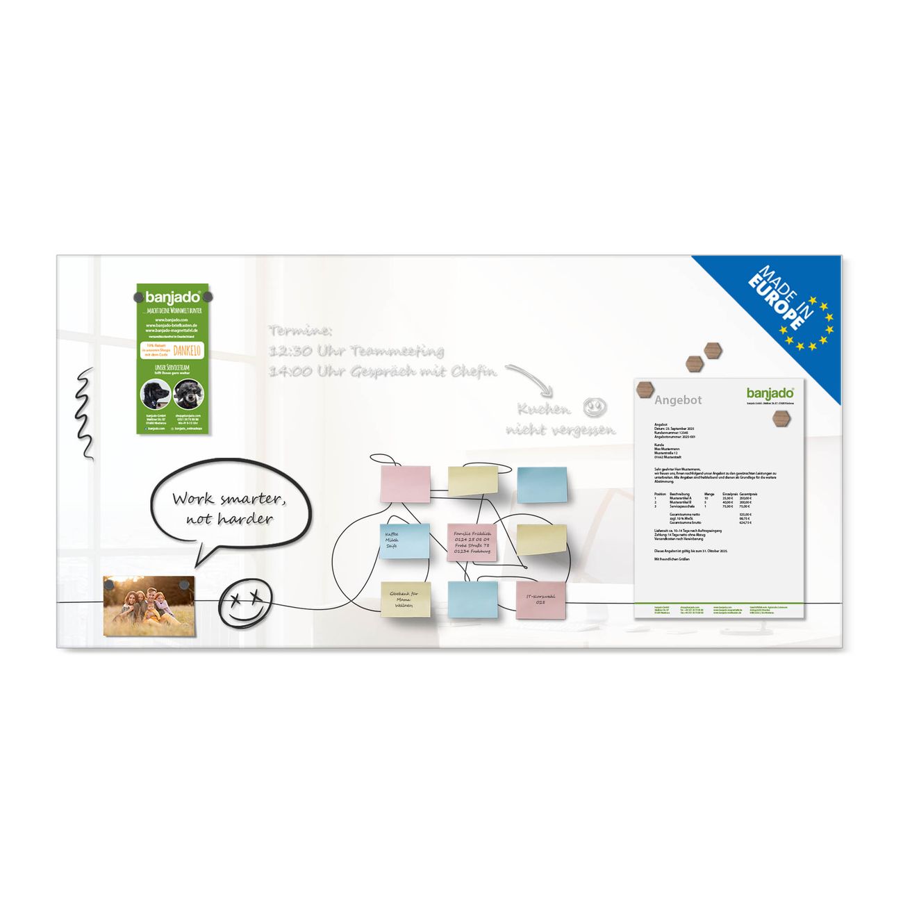 Jede Glas Magnettafel wird in unserer Werkstatt von Hand gefertigt und sorgfältig geprüft. So erhalten Sie ein echtes Qualitätsprodukt, das Funktion und Ästhetik perfekt vereint.?? Warum banjado?