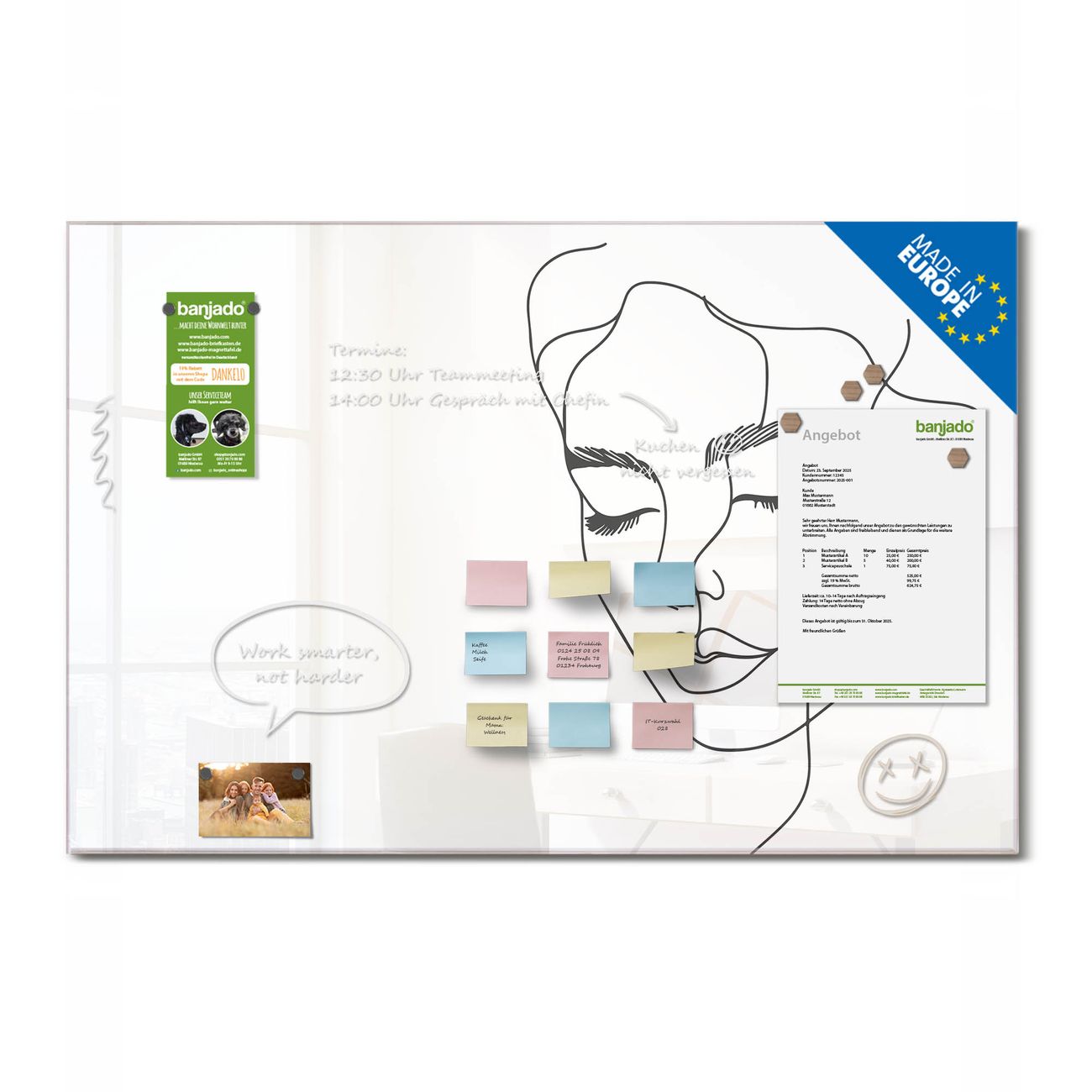 Jede Glas Magnettafel wird in unserer Werkstatt von Hand gefertigt und sorgfältig geprüft. So erhalten Sie ein echtes Qualitätsprodukt, das Funktion und Ästhetik perfekt vereint.?? Warum banjado?