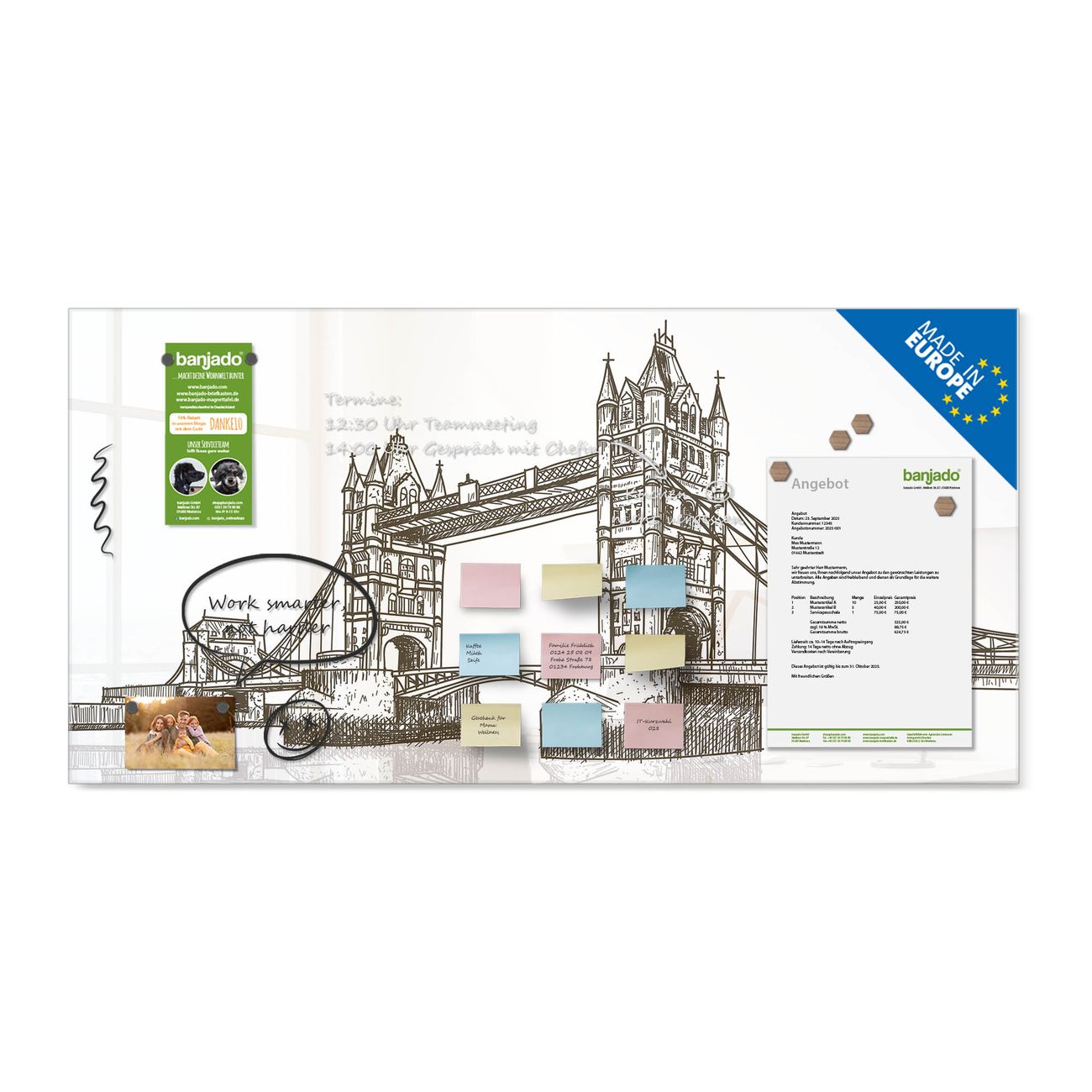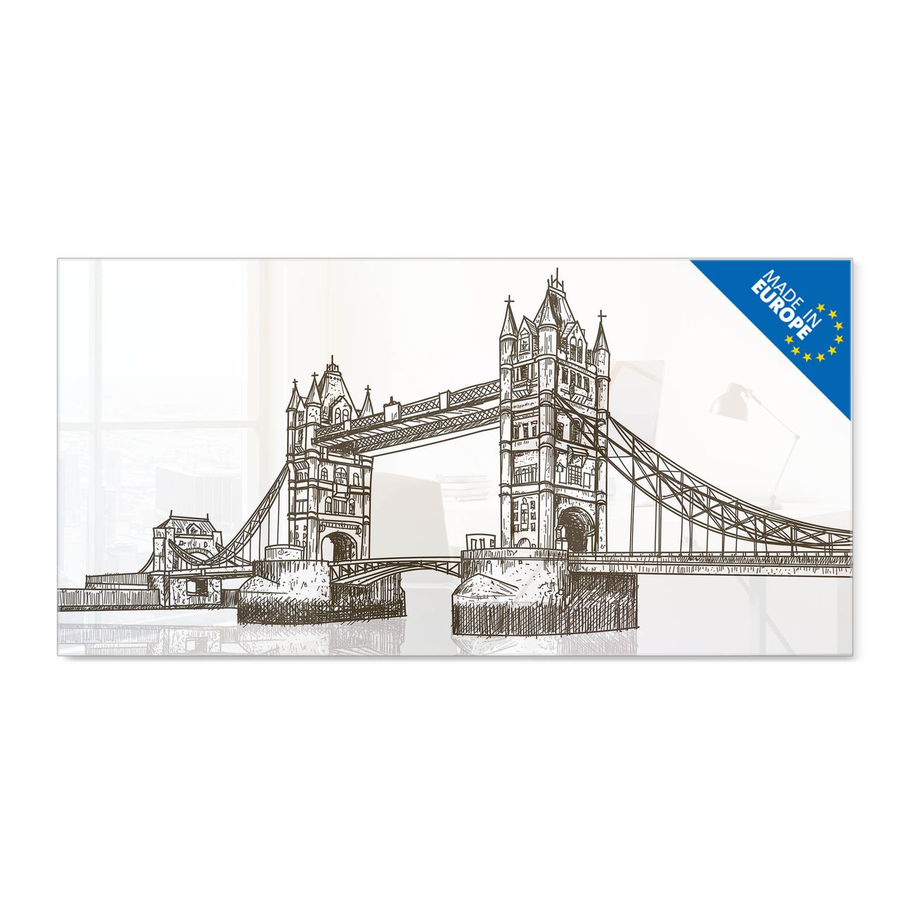 Ein Stück Design, das Ihren Alltag organisiert. Schreiben, heften, inspirieren - alles an einem Ort. Qualität, die man spürt. Montage leicht gemacht. Handwerk mit Herz - veredelt in Sachsen. Einzigartiges Design mit Motiv Motiv London Brücke Illustration Beschreibbare Glasoberfläche, leicht zu reinigen Starke Magnetkraft durch Stahlrückwand Inklusive 4 Neodym-Magneten Flexible Montageoptionen Handveredelt in Sachsen - Qualität, die bleibt