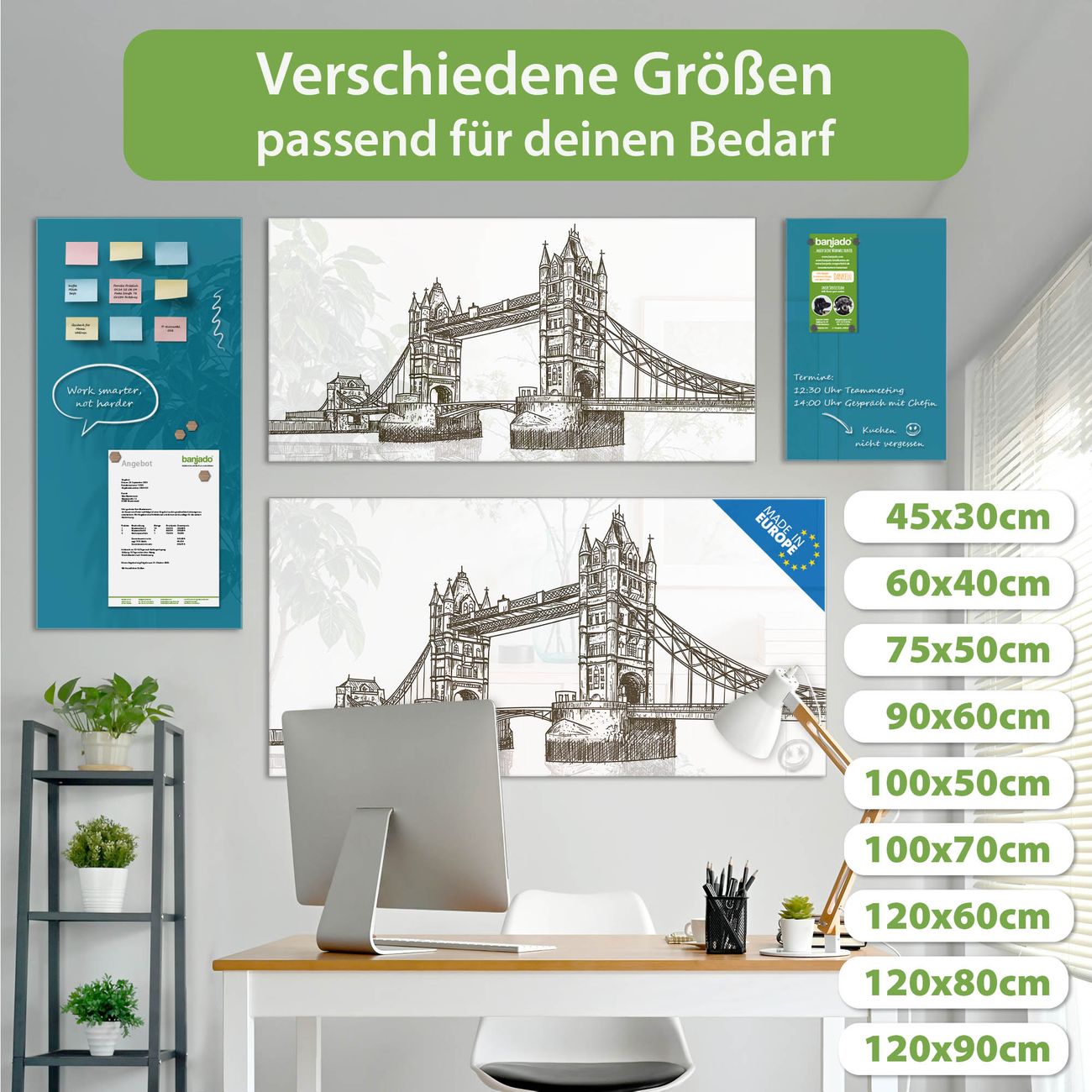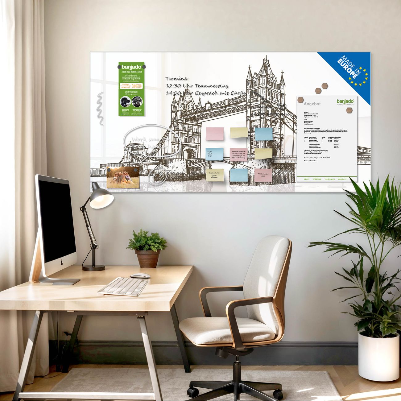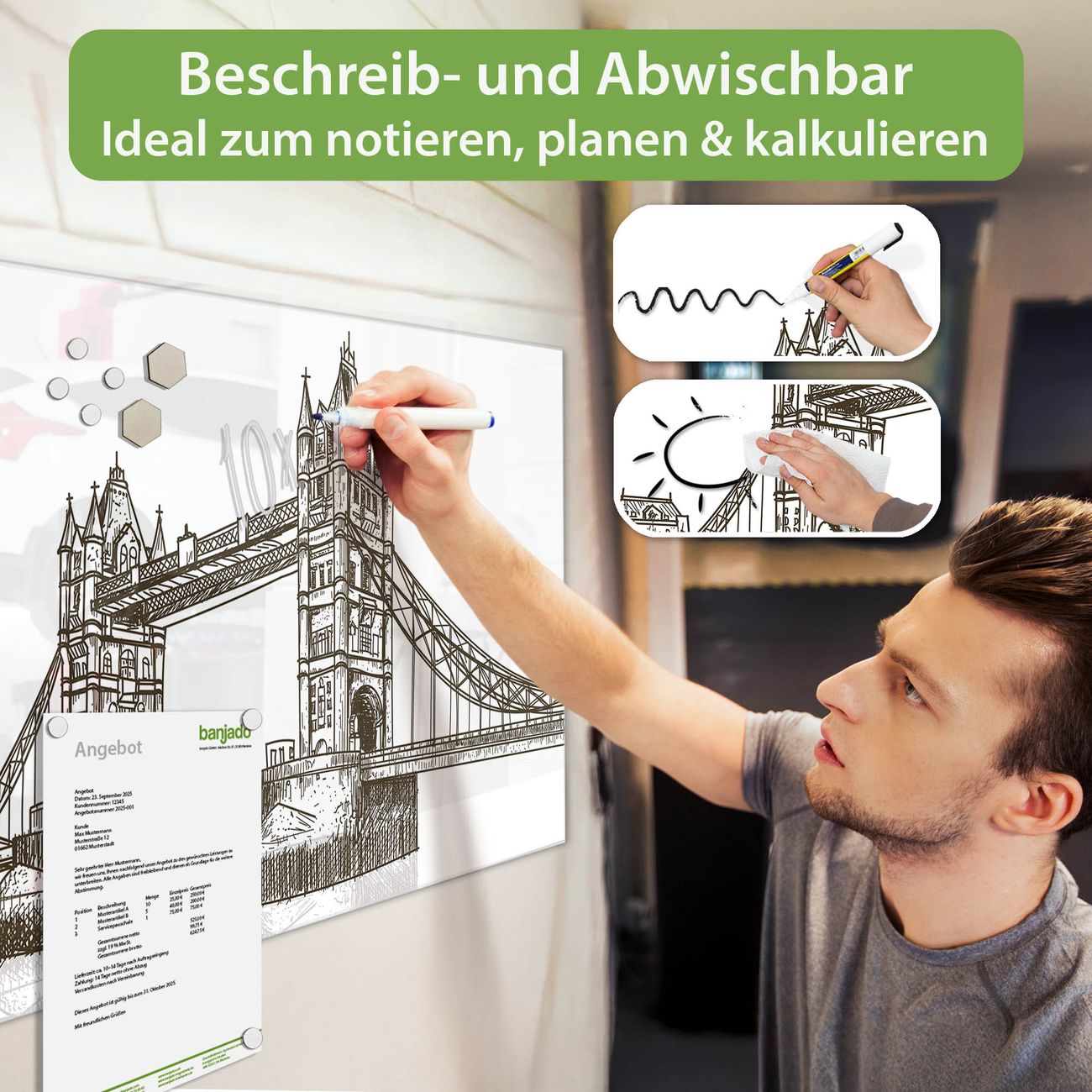 Jede Glas Magnettafel wird in unserer Werkstatt von Hand gefertigt und sorgfältig geprüft. So erhalten Sie ein echtes Qualitätsprodukt, das Funktion und Ästhetik perfekt vereint.?? Warum banjado?
