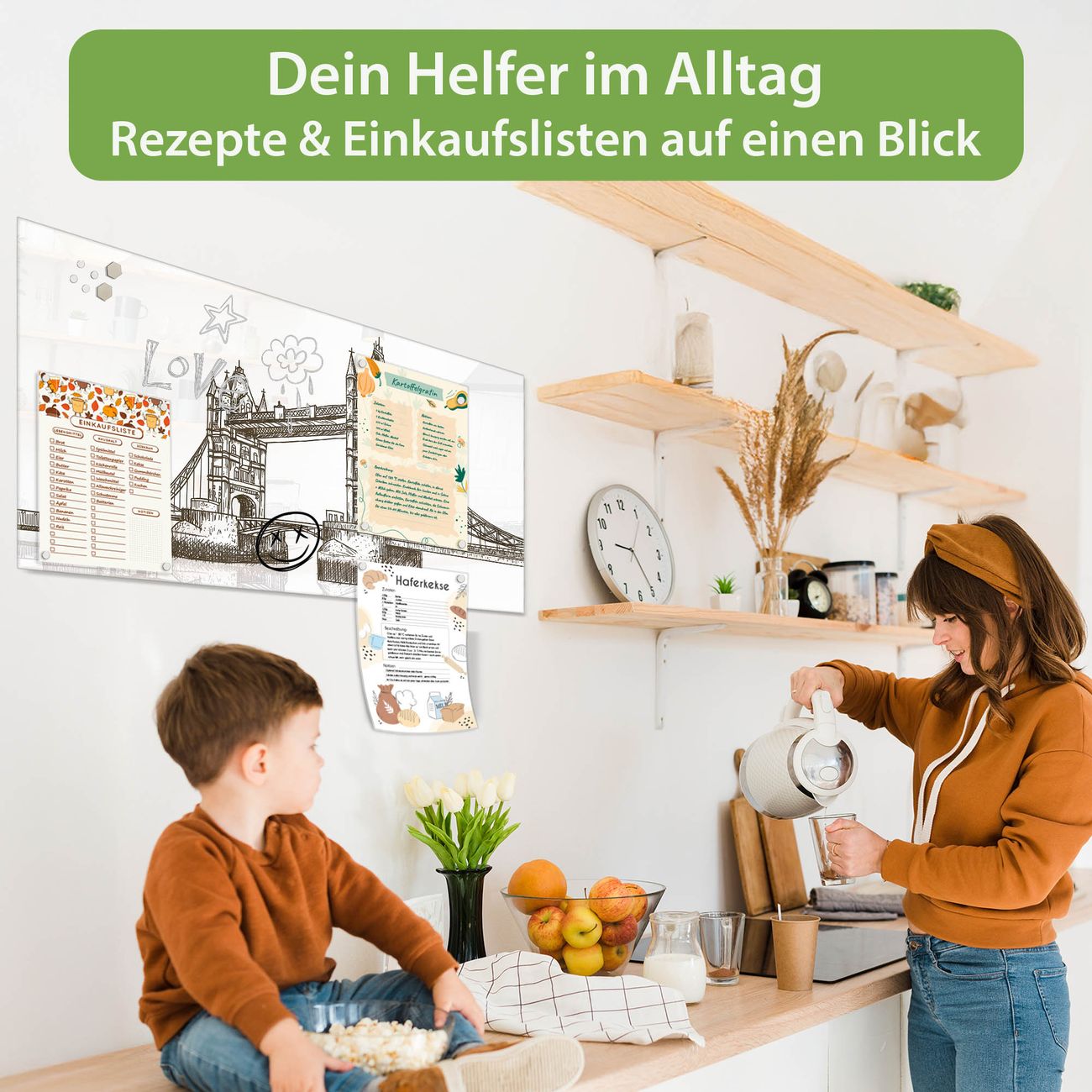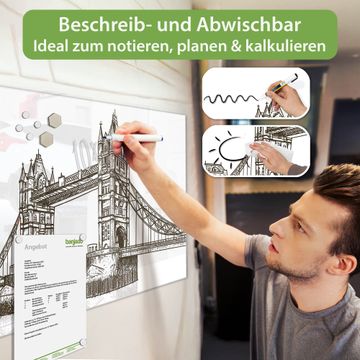 Auf der glatten Glasoberfläche lassen sich Termine, Rezepte oder Notizen ganz einfach mit Kreidestiften festhalten und rückstandslos entfernen. Starke Neodym-Magnete halten Ihre wichtigsten Erinnerungen sicher an Ort und Stelle. So entsteht Ihre ganz persönliche Ideenwand - jeden Tag neu.