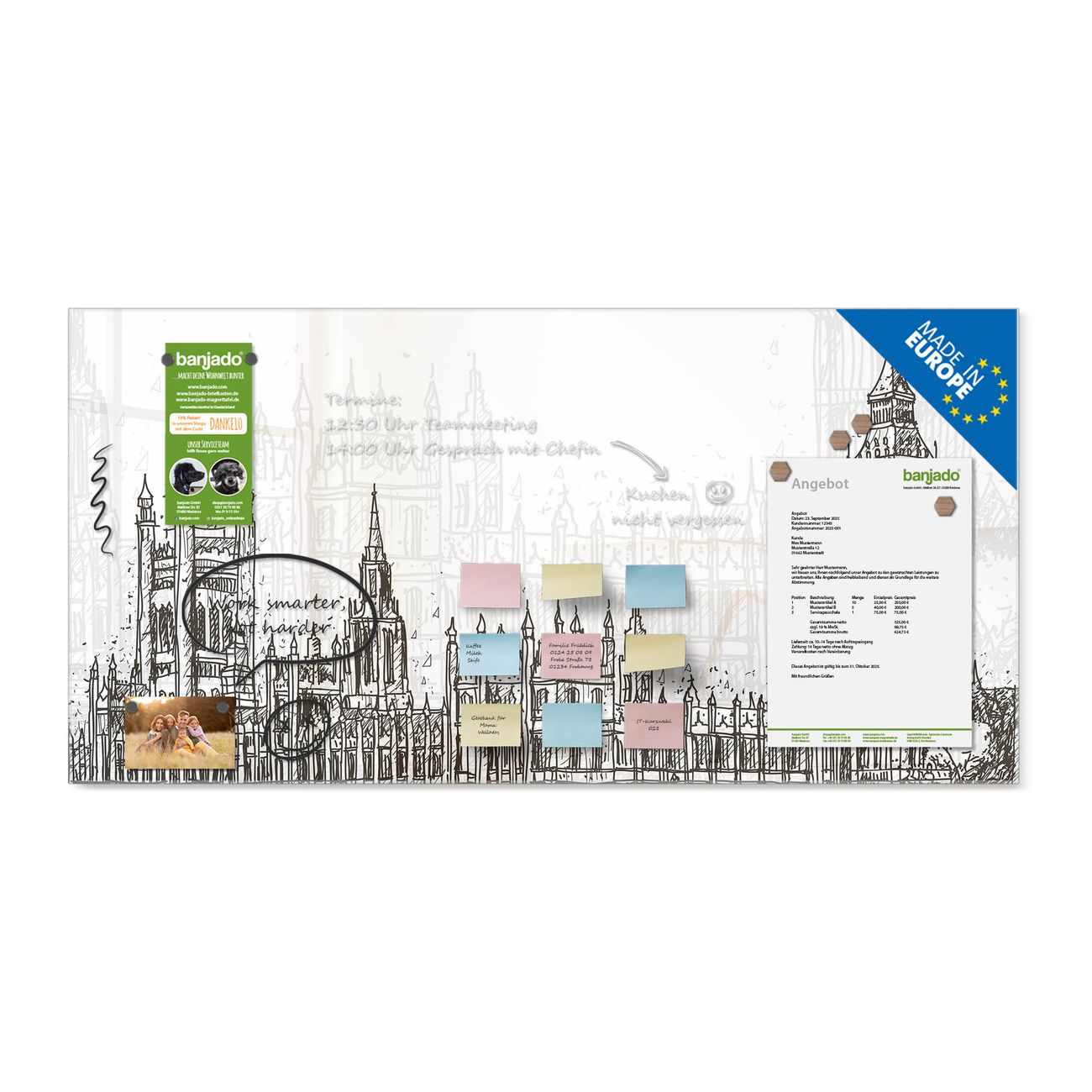 Jede Glas Magnettafel wird in unserer Werkstatt von Hand gefertigt und sorgfältig geprüft. So erhalten Sie ein echtes Qualitätsprodukt, das Funktion und Ästhetik perfekt vereint.?? Warum banjado?