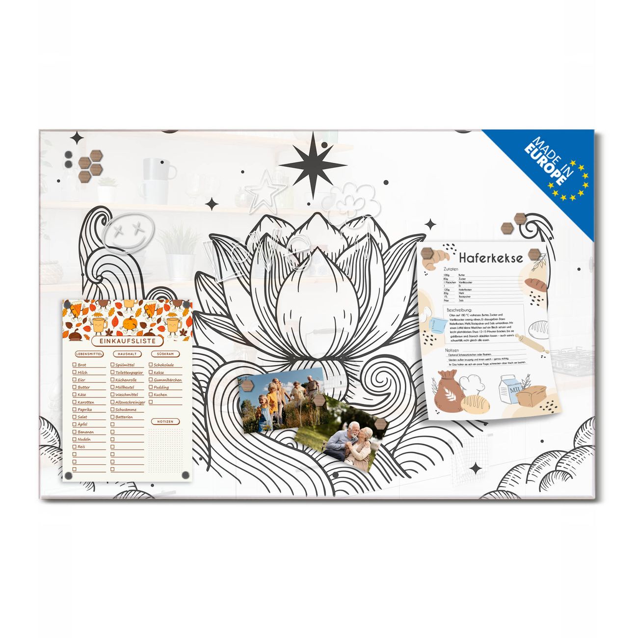 Ein Stück Design, das Ihren Alltag organisiert. Schreiben, heften, inspirieren - alles an einem Ort. Qualität, die man spürt. Montage leicht gemacht. Handwerk mit Herz - veredelt in Sachsen. Einzigartiges Design mit Motiv Motiv Lotus und Mondphasen 2 Beschreibbare Glasoberfläche, leicht zu reinigen Starke Magnetkraft durch Stahlrückwand Inklusive 4 Neodym-Magneten Flexible Montageoptionen Handveredelt in Sachsen - Qualität, die bleibt