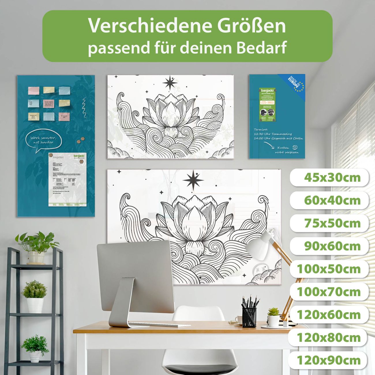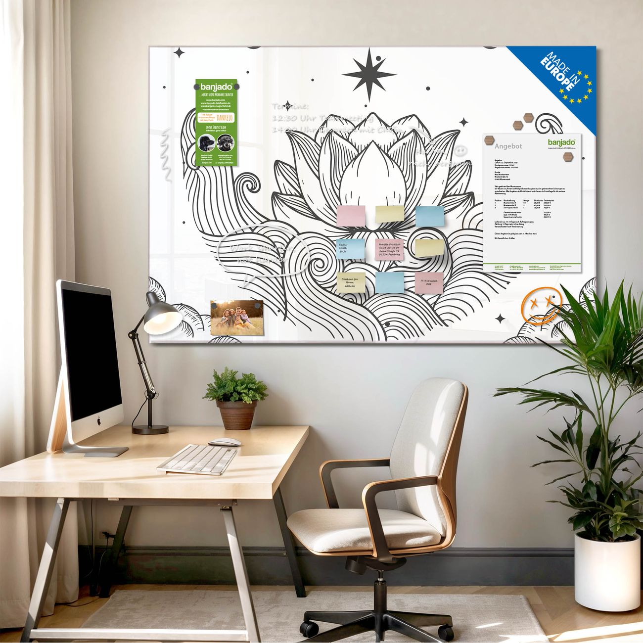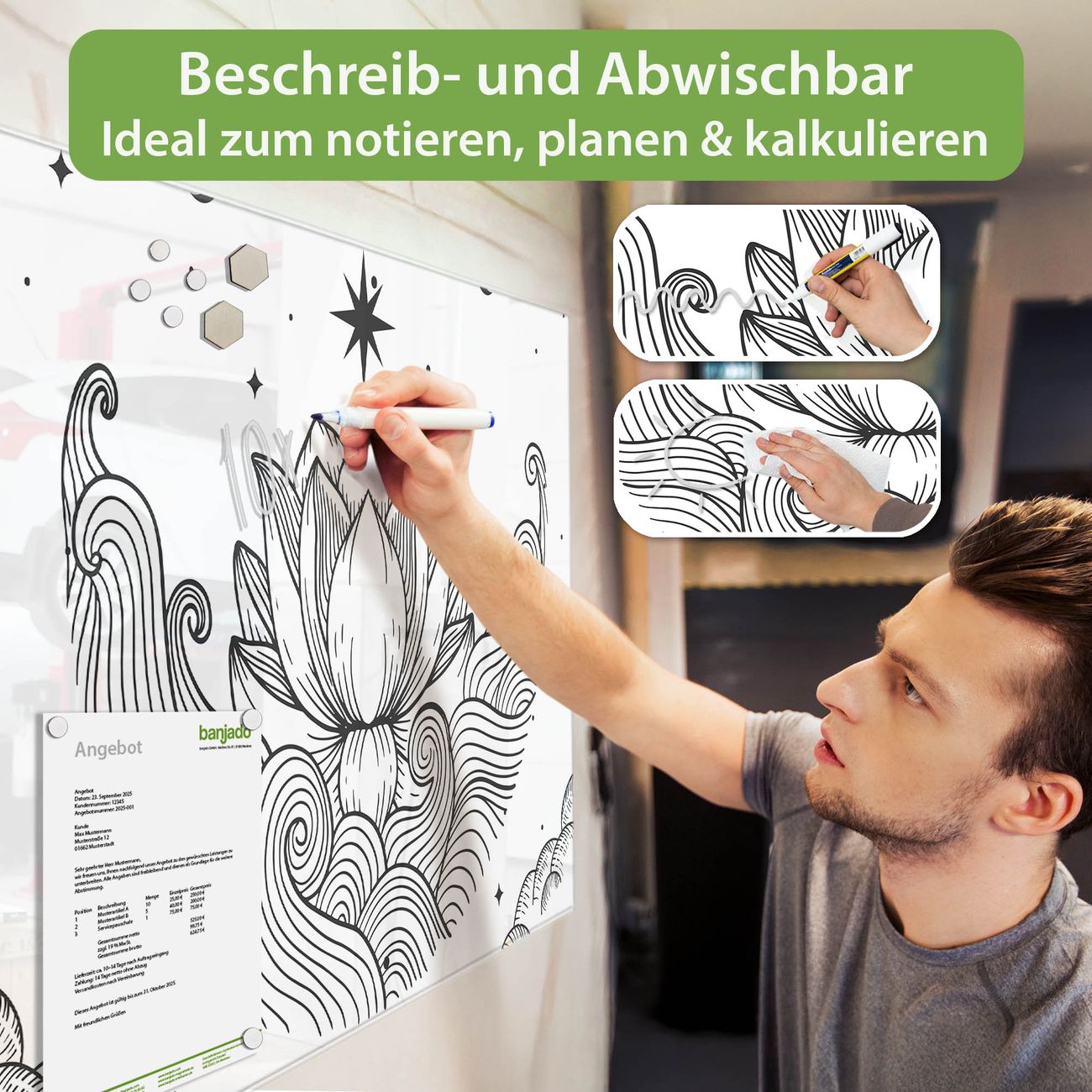 Jede Glas Magnettafel wird in unserer Werkstatt von Hand gefertigt und sorgfältig geprüft. So erhalten Sie ein echtes Qualitätsprodukt, das Funktion und Ästhetik perfekt vereint.?? Warum banjado?