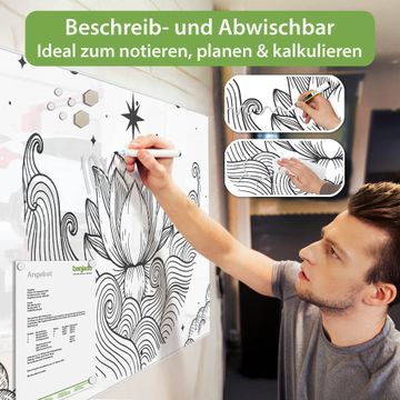 Die banjado Glas Magnettafel mit dem Motiv Motiv Lotus und Mondphasen 2 verbindet Funktionalität mit Stil. Sie ersetzt das Zettelchaos durch klare Strukturen und bringt dabei eine warme, natürliche Atmosphäre in Ihr Zuhause. Ob im Büro, in der Küche oder im Eingangsbereich - dieses Design-Board zieht Blicke an und sorgt für Ordnung mit Charakter.