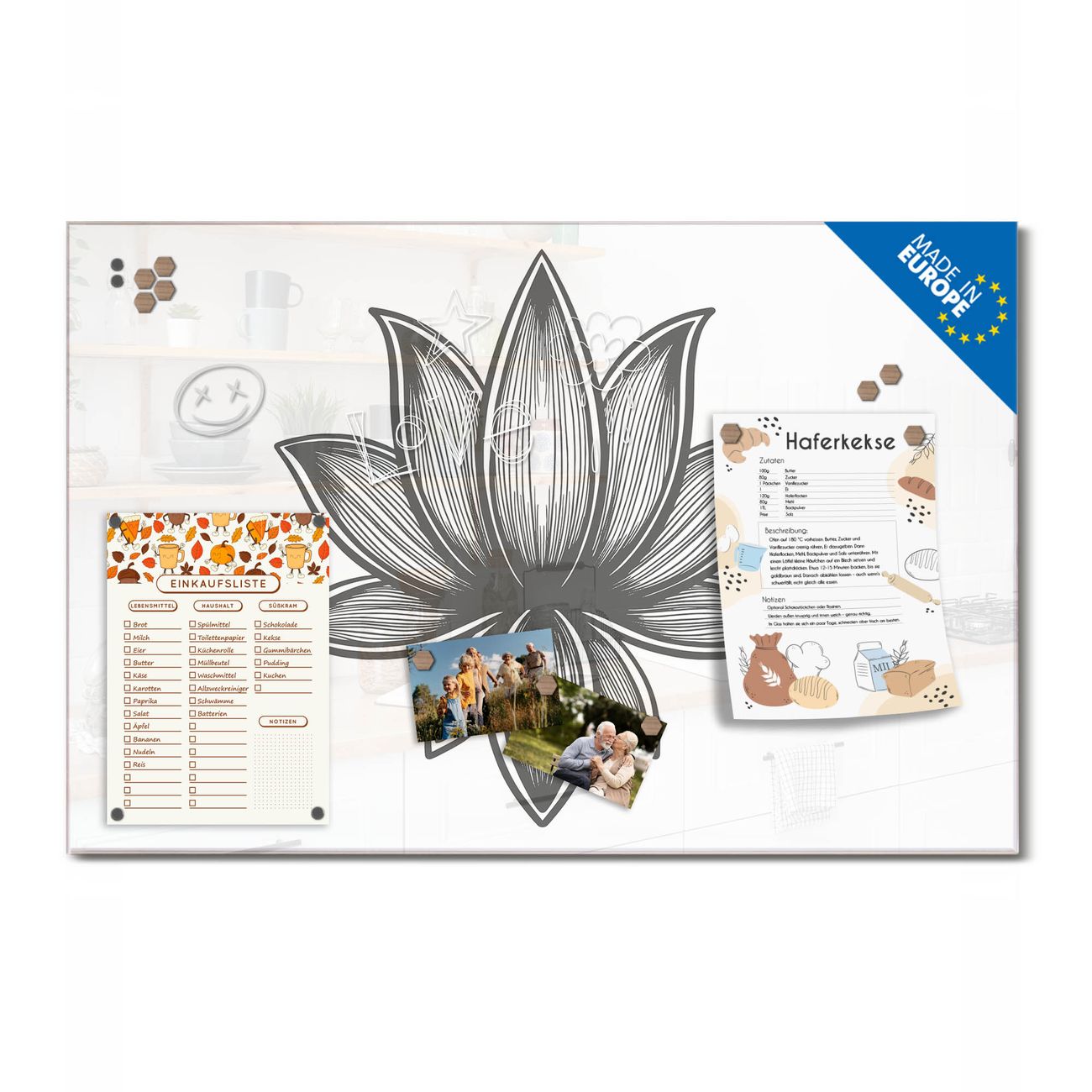 Ein Stück Design, das Ihren Alltag organisiert. Schreiben, heften, inspirieren - alles an einem Ort. Qualität, die man spürt. Montage leicht gemacht. Handwerk mit Herz - veredelt in Sachsen. Einzigartiges Design mit Motiv Motiv Lotusblüte 10 Beschreibbare Glasoberfläche, leicht zu reinigen Starke Magnetkraft durch Stahlrückwand Inklusive 4 Neodym-Magneten Flexible Montageoptionen Handveredelt in Sachsen - Qualität, die bleibt