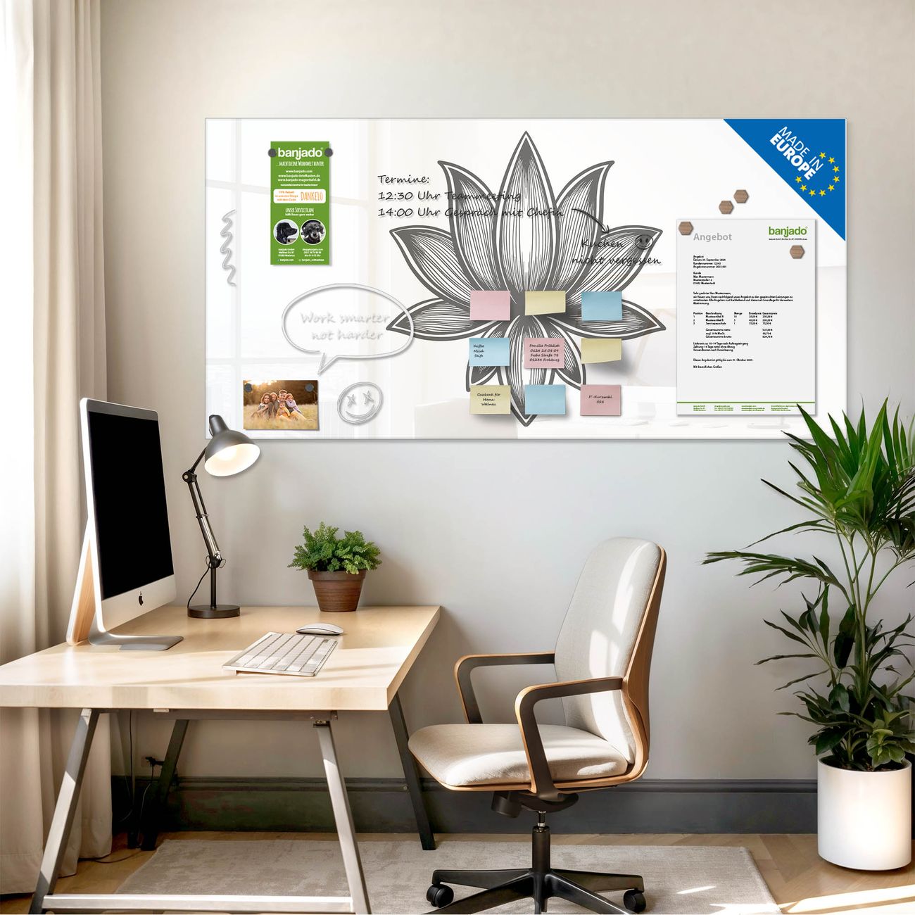 Jede Glas Magnettafel wird in unserer Werkstatt von Hand gefertigt und sorgfältig geprüft. So erhalten Sie ein echtes Qualitätsprodukt, das Funktion und Ästhetik perfekt vereint.?? Warum banjado?