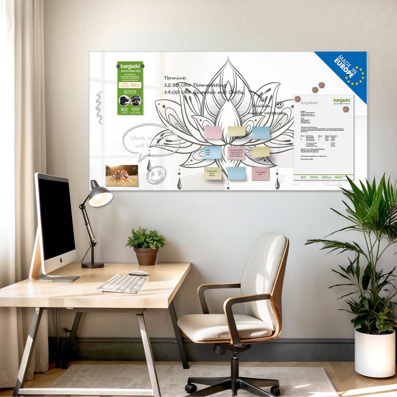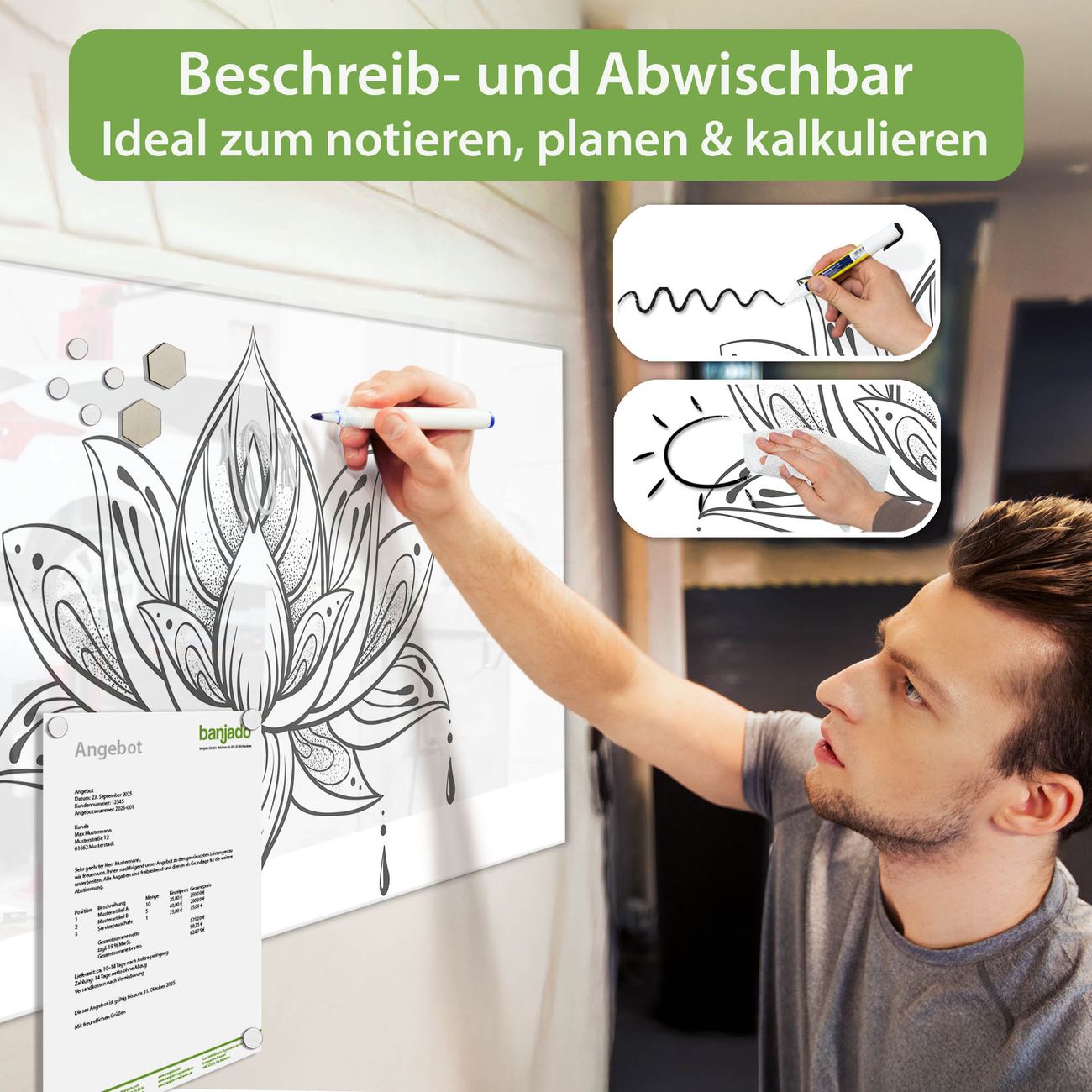 Die banjado Glas Magnettafel mit dem Motiv Motiv Lotusblüte 6 verbindet Funktionalität mit Stil. Sie ersetzt das Zettelchaos durch klare Strukturen und bringt dabei eine warme, natürliche Atmosphäre in Ihr Zuhause. Ob im Büro, in der Küche oder im Eingangsbereich - dieses Design-Board zieht Blicke an und sorgt für Ordnung mit Charakter.