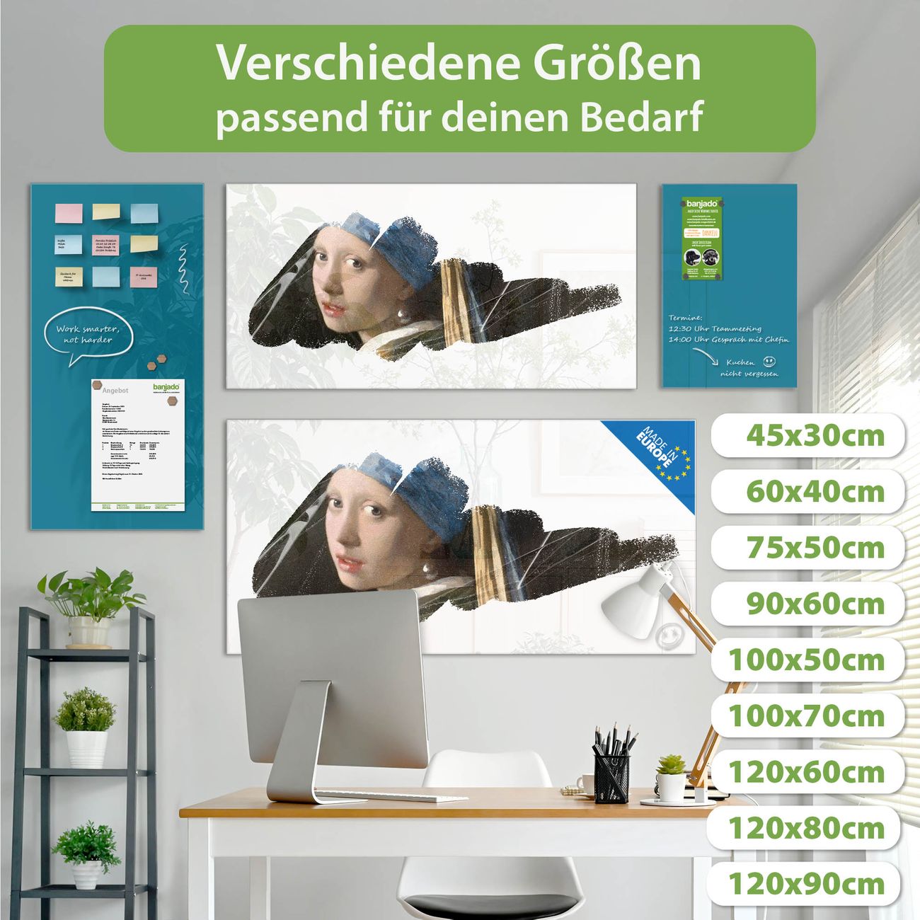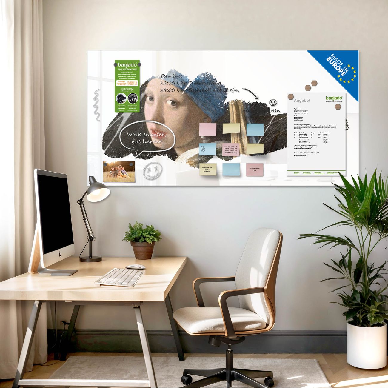 Jede Glas Magnettafel wird in unserer Werkstatt von Hand gefertigt und sorgfältig geprüft. So erhalten Sie ein echtes Qualitätsprodukt, das Funktion und Ästhetik perfekt vereint.?? Warum banjado?