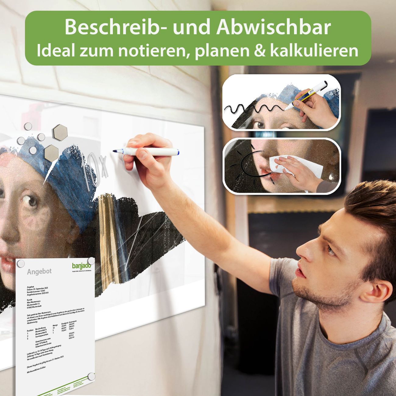 Ein Stück Design, das Ihren Alltag organisiert. Schreiben, heften, inspirieren - alles an einem Ort. Qualität, die man spürt. Montage leicht gemacht. Handwerk mit Herz - veredelt in Sachsen. Einzigartiges Design mit Motiv Motiv Mädchen mit dem Perlenohrring Beschreibbare Glasoberfläche, leicht zu reinigen Starke Magnetkraft durch Stahlrückwand Inklusive 4 Neodym-Magneten Flexible Montageoptionen Handveredelt in Sachsen - Qualität, die bleibt