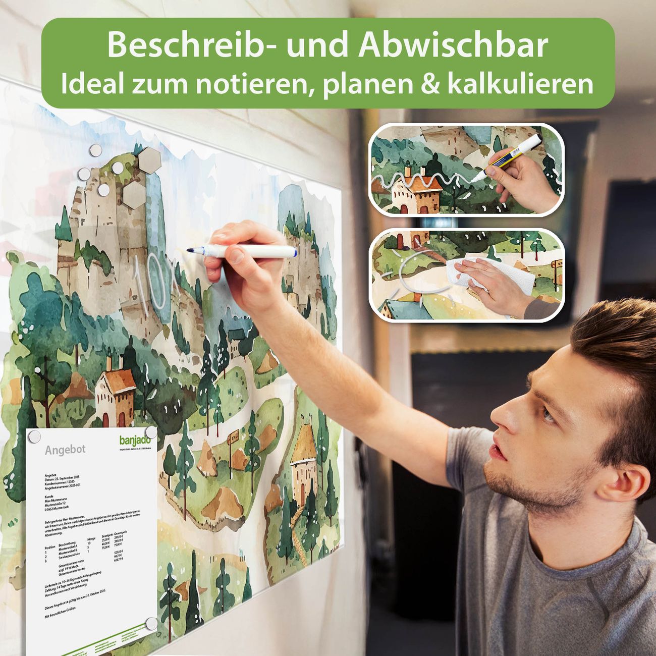 Jede Glas Magnettafel wird in unserer Werkstatt von Hand gefertigt und sorgfältig geprüft. So erhalten Sie ein echtes Qualitätsprodukt, das Funktion und Ästhetik perfekt vereint.?? Warum banjado?