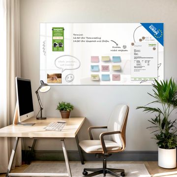 Auf der glatten Glasoberfläche lassen sich Termine, Rezepte oder Notizen ganz einfach mit Kreidestiften festhalten und rückstandslos entfernen. Starke Neodym-Magnete halten Ihre wichtigsten Erinnerungen sicher an Ort und Stelle. So entsteht Ihre ganz persönliche Ideenwand - jeden Tag neu.