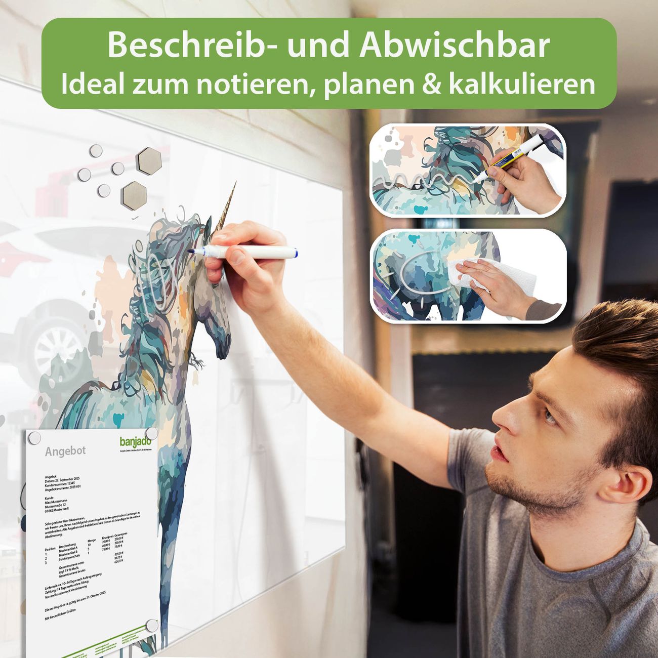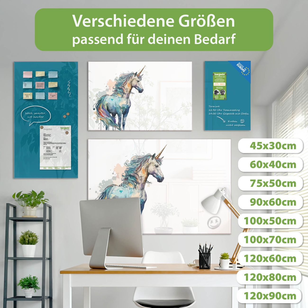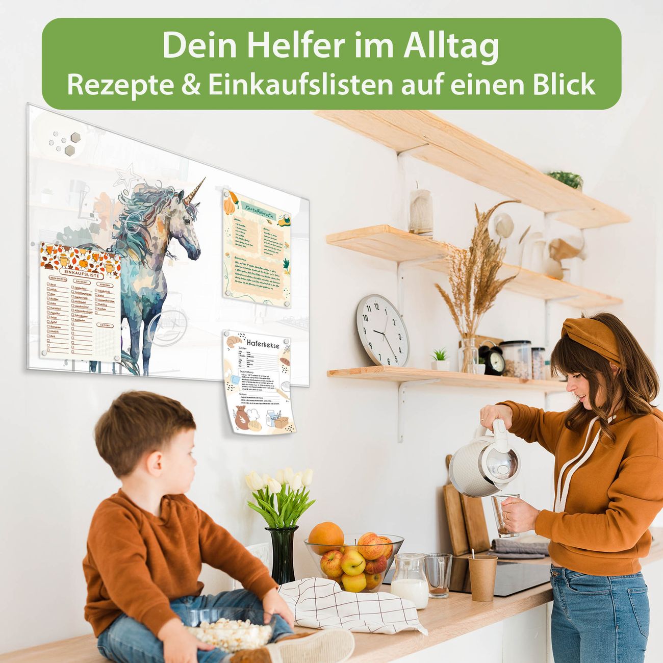 Ein Stück Design, das Ihren Alltag organisiert. Schreiben, heften, inspirieren - alles an einem Ort. Qualität, die man spürt. Montage leicht gemacht. Handwerk mit Herz - veredelt in Sachsen. Einzigartiges Design mit Motiv Motiv Magisches Einhorn Beschreibbare Glasoberfläche, leicht zu reinigen Starke Magnetkraft durch Stahlrückwand Inklusive 4 Neodym-Magneten Flexible Montageoptionen Handveredelt in Sachsen - Qualität, die bleibt