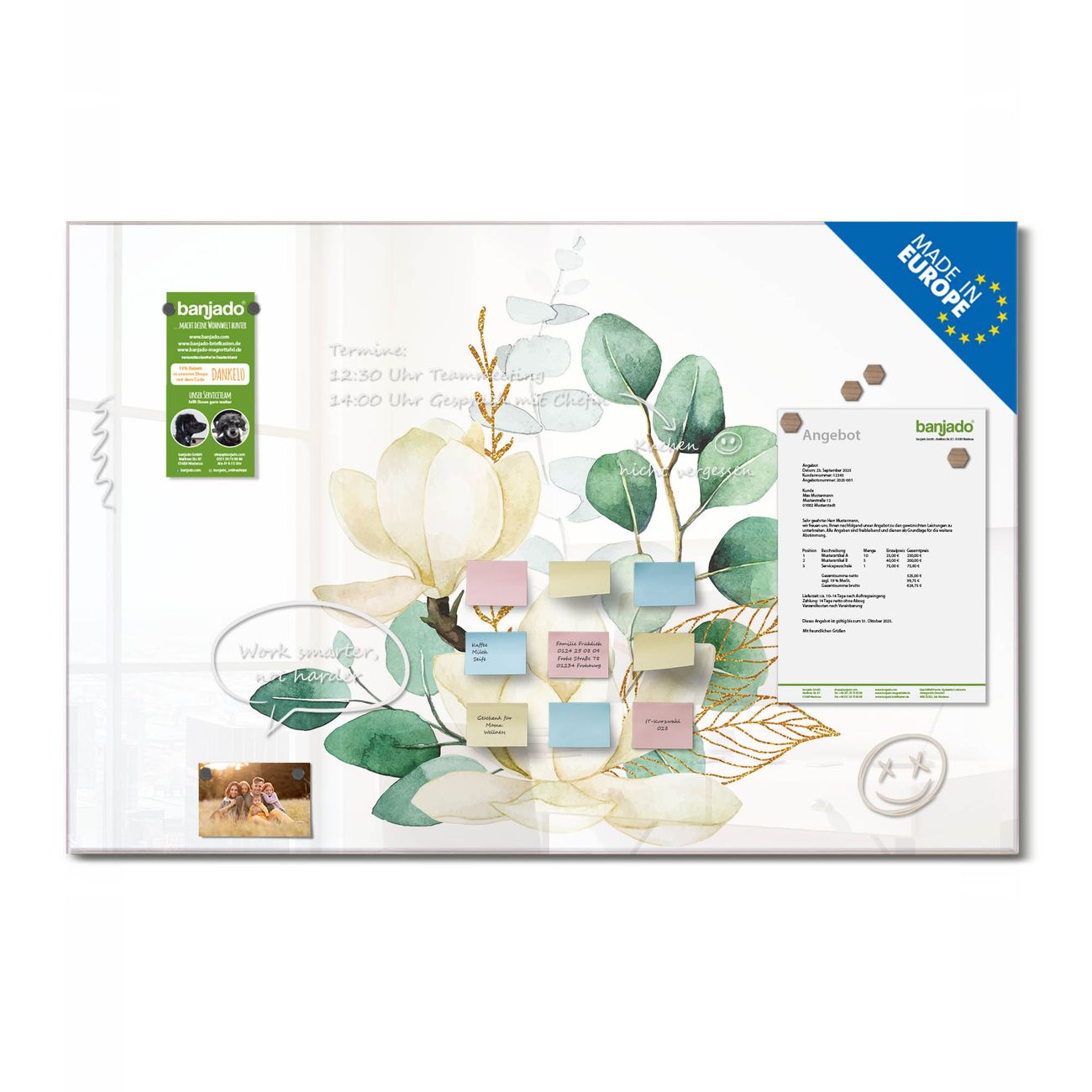 Jede Glas Magnettafel wird in unserer Werkstatt von Hand gefertigt und sorgfältig geprüft. So erhalten Sie ein echtes Qualitätsprodukt, das Funktion und Ästhetik perfekt vereint.?? Warum banjado?