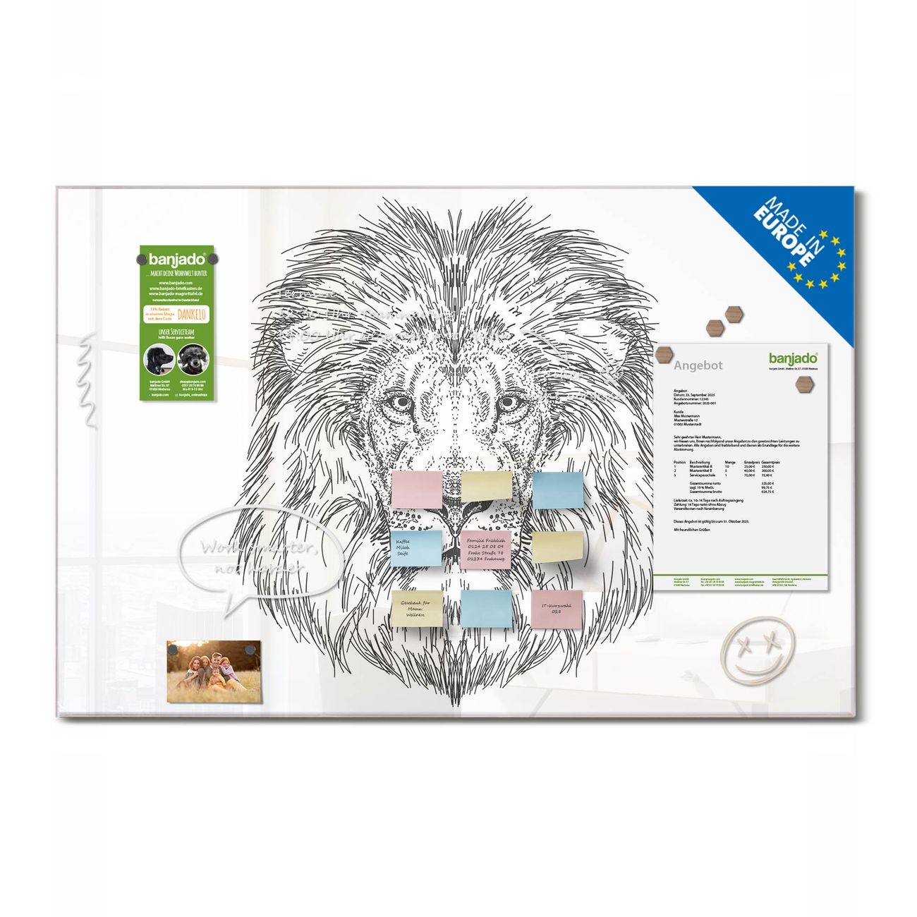 Ein Stück Design, das Ihren Alltag organisiert. Schreiben, heften, inspirieren - alles an einem Ort. Qualität, die man spürt. Montage leicht gemacht. Handwerk mit Herz - veredelt in Sachsen. Einzigartiges Design mit Motiv Motiv Majestätischer Löwe Beschreibbare Glasoberfläche, leicht zu reinigen Starke Magnetkraft durch Stahlrückwand Inklusive 4 Neodym-Magneten Flexible Montageoptionen Handveredelt in Sachsen - Qualität, die bleibt
