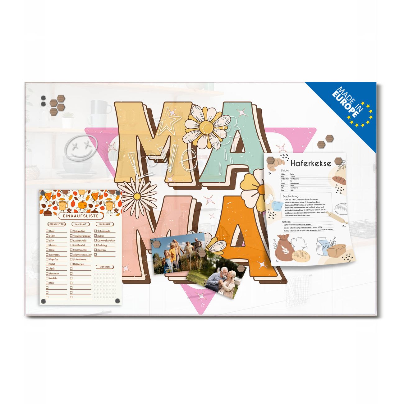 Ein Stück Design, das Ihren Alltag organisiert. Schreiben, heften, inspirieren - alles an einem Ort. Qualität, die man spürt. Montage leicht gemacht. Handwerk mit Herz - veredelt in Sachsen. Einzigartiges Design mit Motiv Motiv Mama Liebe Retro Beschreibbare Glasoberfläche, leicht zu reinigen Starke Magnetkraft durch Stahlrückwand Inklusive 4 Neodym-Magneten Flexible Montageoptionen Handveredelt in Sachsen - Qualität, die bleibt