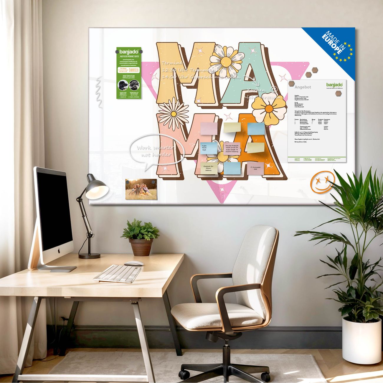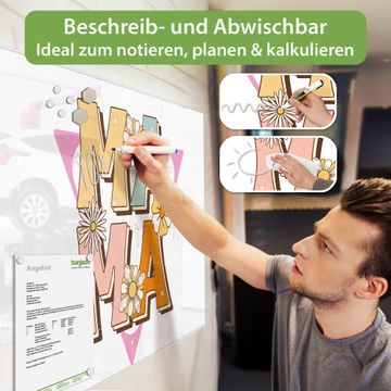 Die banjado Glas Magnettafel mit dem Motiv Motiv Mama Liebe Retro verbindet Funktionalität mit Stil. Sie ersetzt das Zettelchaos durch klare Strukturen und bringt dabei eine warme, natürliche Atmosphäre in Ihr Zuhause. Ob im Büro, in der Küche oder im Eingangsbereich - dieses Design-Board zieht Blicke an und sorgt für Ordnung mit Charakter.